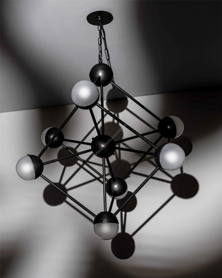 An elementary mesh of crystallized iron describes the spirit of a bright future- the late 1950s provides inspiration for this stylish chandelier. The Molecule recalls the aesthetic of industry rendered in elegant brass and distinctive half round glass globes.