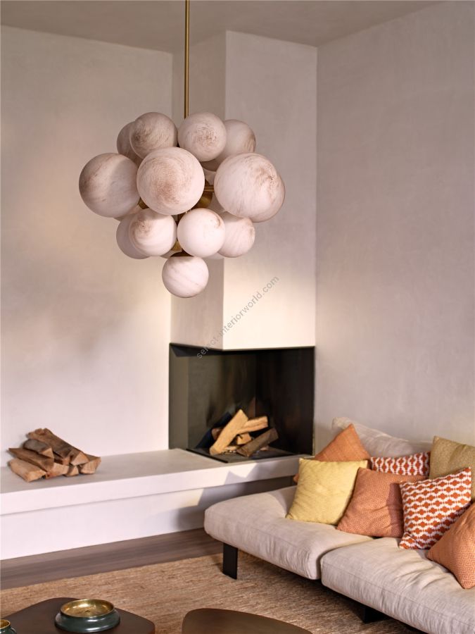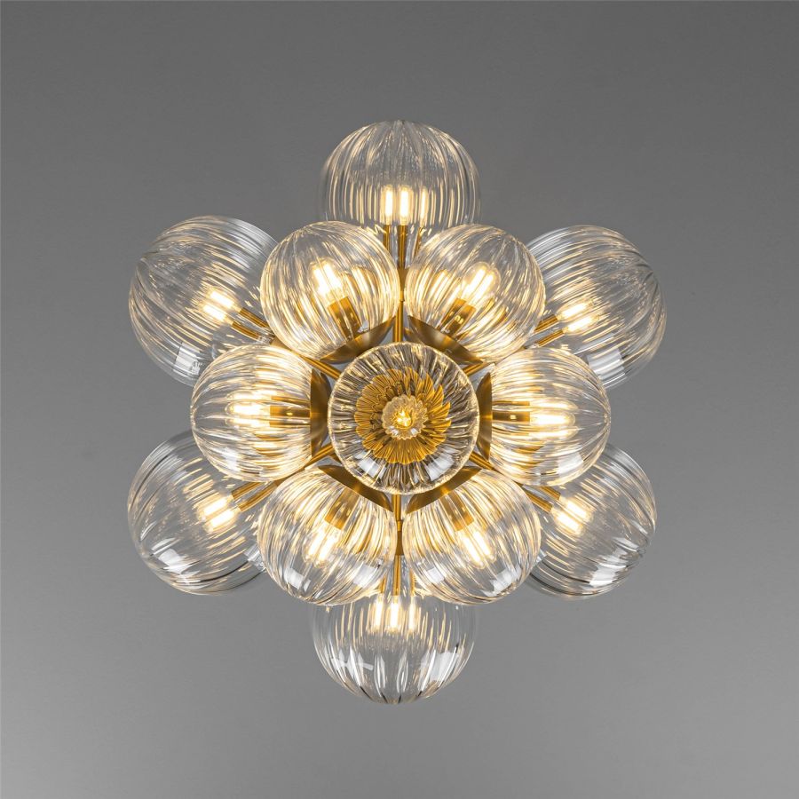 An effervescent cluster of glass spheres cumulates around a pendant brass frame. Majestic and modern, the composition invites a gestalt perspective shift when glimpsed from different angles: from side-on, a stellar cluster; from below, a single six-pointed star.