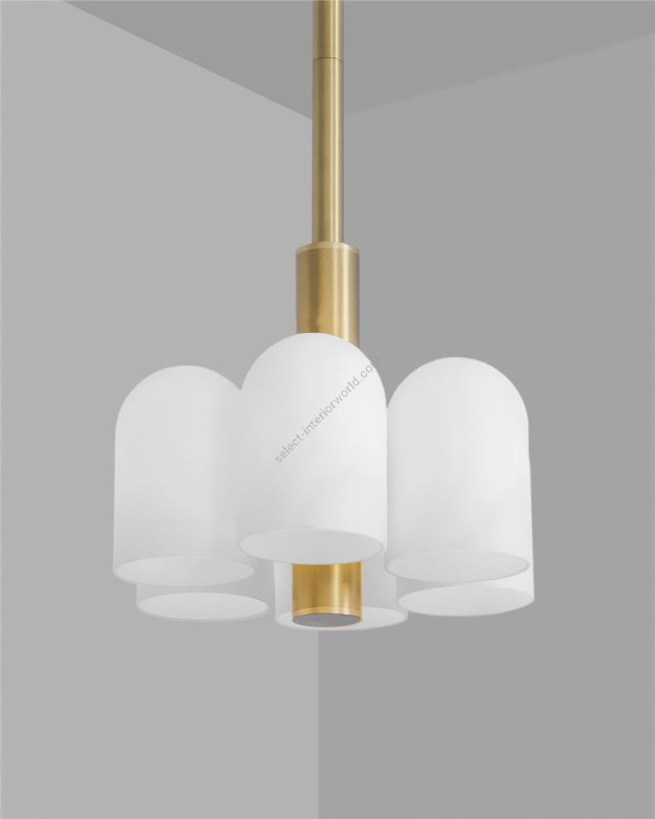 Influenced by the fashions of the future, in large and small scale. A honeycomb structure of six glass shades suggests stored energy. Gracefully suspended with a central brass shaft, the structure echoing its potential.