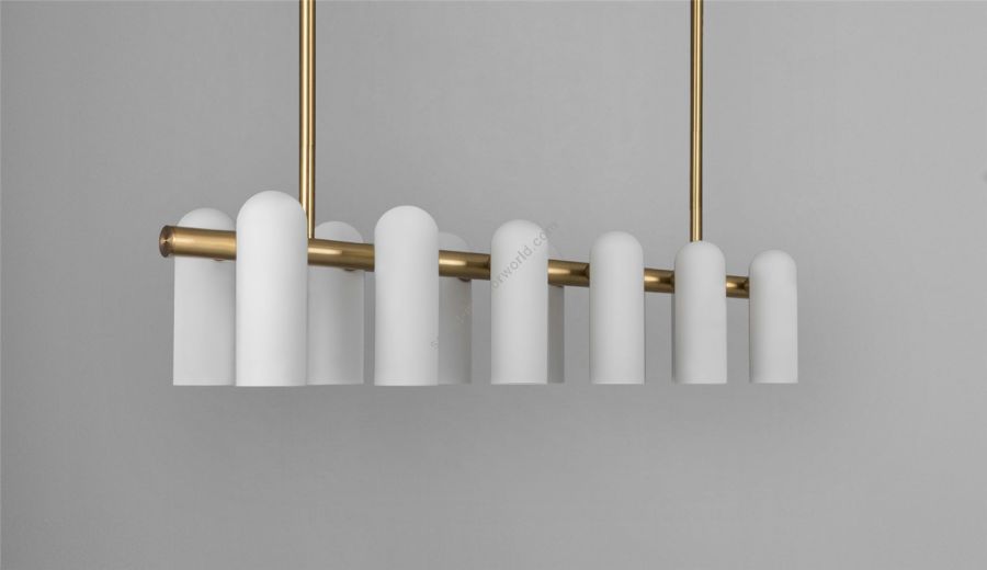A colonnade of light sources. This delicate engine of frosted glass generates a luminous environment while contrasting brass elements create a sense of stability.