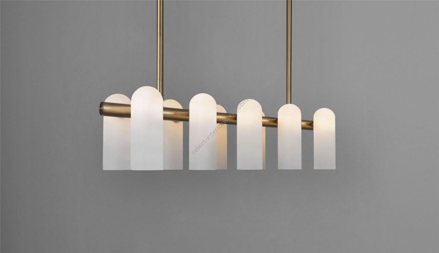 A colonnade of light sources. This delicate engine of frosted glass generates a luminous environment while contrasting brass elements create a sense of stability.