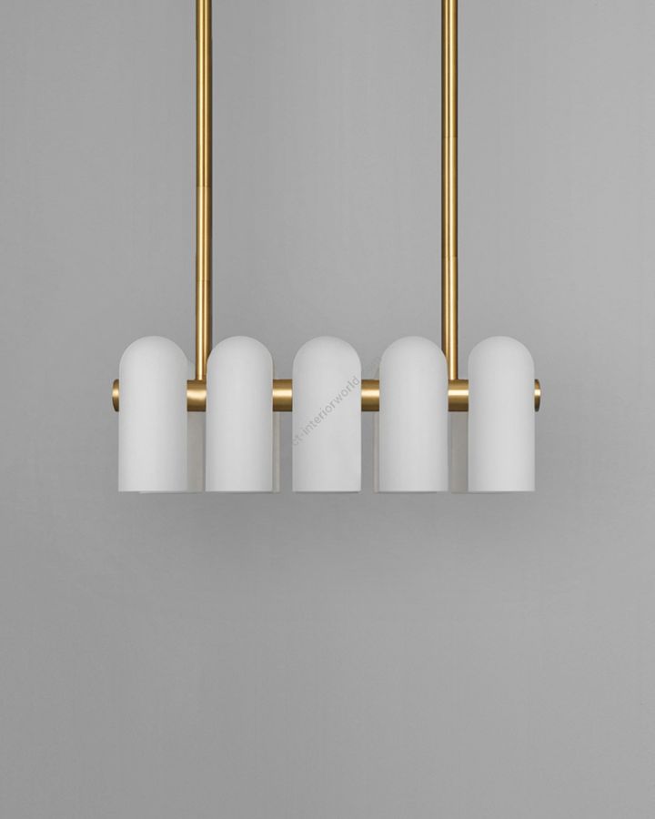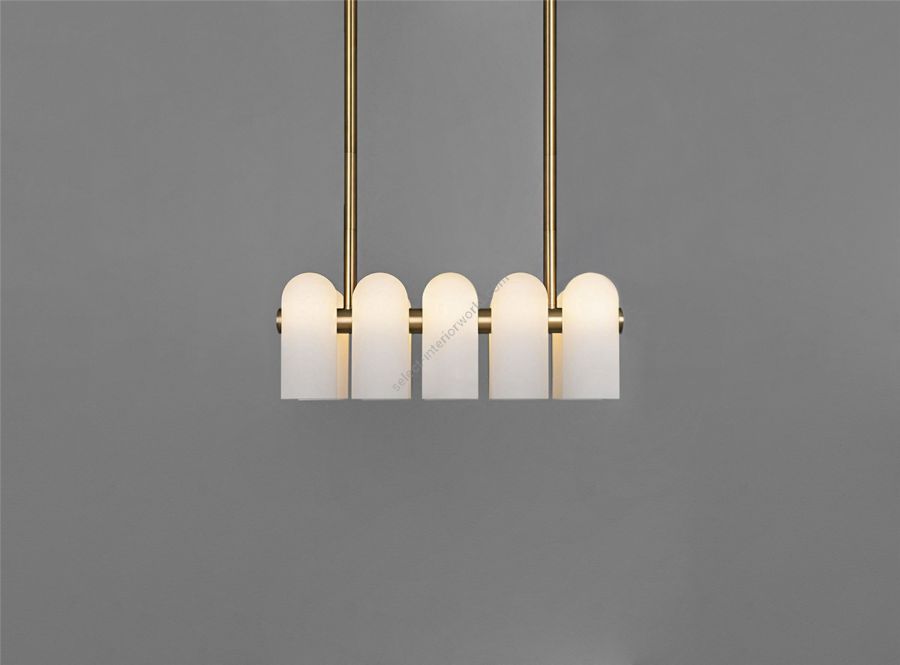 A colonnade of light sources. This delicate engine of frosted glass generates a luminous environment while contrasting brass elements create a sense of stability.
