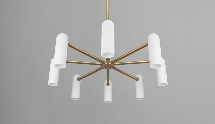Spokes of brass hold slender lampshades, the circle of light creating a planetary effect in this striking round chandelier. Arched shapes drape downward while emanating an atmospheric twinkle.
