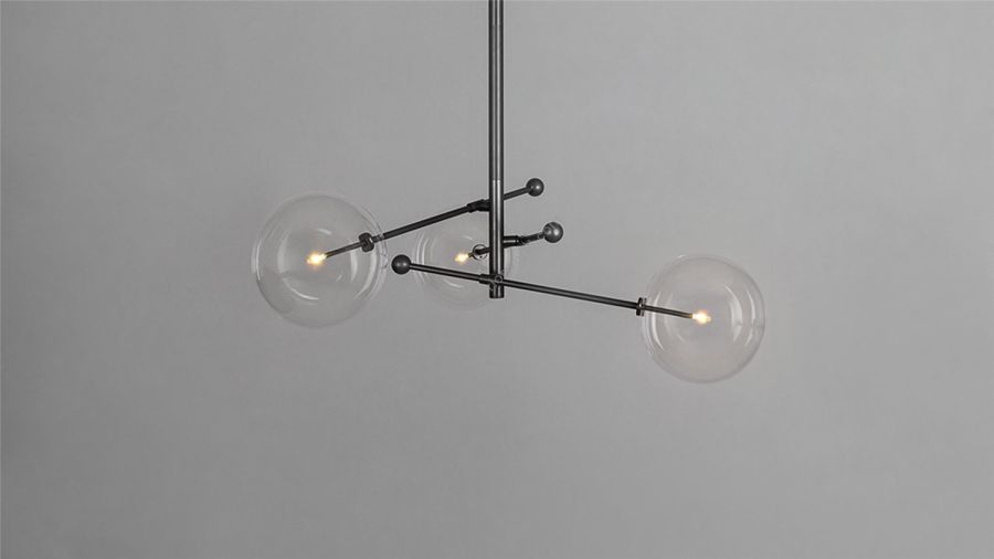 A trio of mouth-blown glass globes orbit a central axis, poised on adjustable cantilevered brass arms. The modular asymmetry of the intersecting angles forms a gyroscopic composition, bringing an interstellar elegance to a space.
