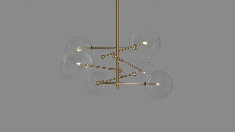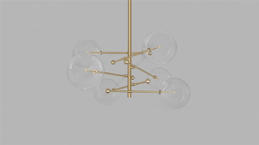A sextet of mouth-blown glass globes orbits a central axis, poised on adjustable cantilevered brass arms. The modular asymmetry of the intersecting angles forms a gyroscopic composition, bringing an interstellar elegance to a space.