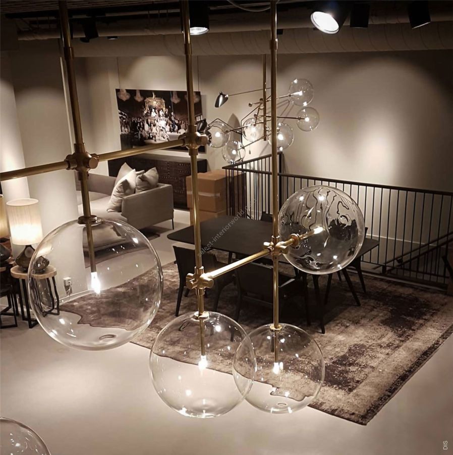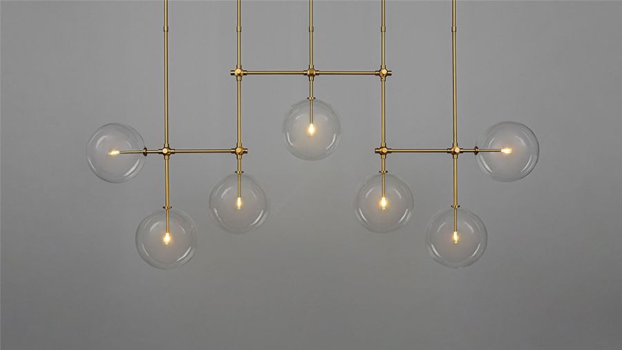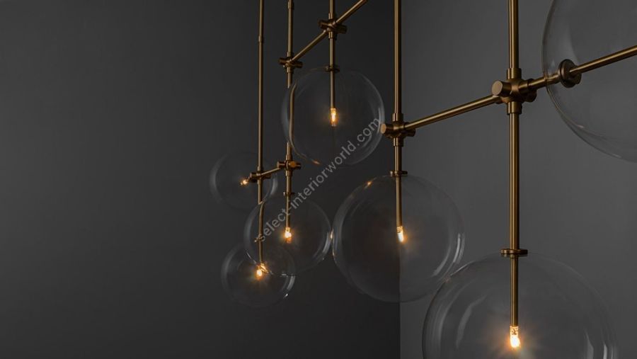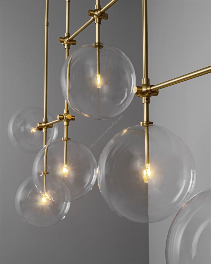An array of ethereal glass globes floats weightlessly around a geometric lattice. The linear symmetry of the brass grid creates a covalent frame for the sparkling mouth-blown spheres.