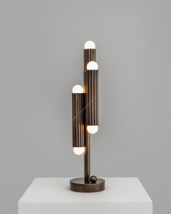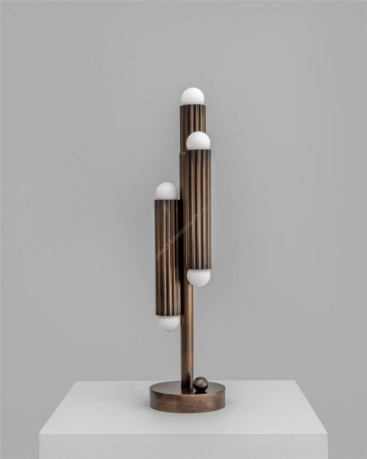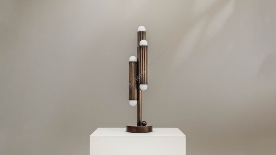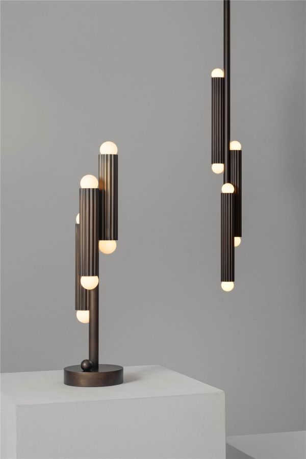 A cascading triad of fluted cylinders orbits a central brass axis, entirely crafted in solid brass. A sculptural study in rhythm, they seem to hover in space, as shadow and light interplay across the fluted surfaces. At the base, a discreet brass orb functions as a dimmer, sculpting the perfect glow. The fusion of structure and softness imparts quiet strength, architectural presence, and lasting elegance.