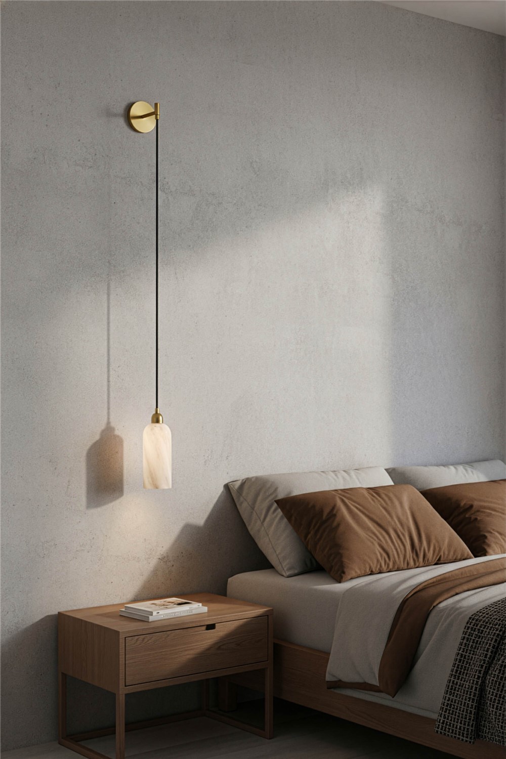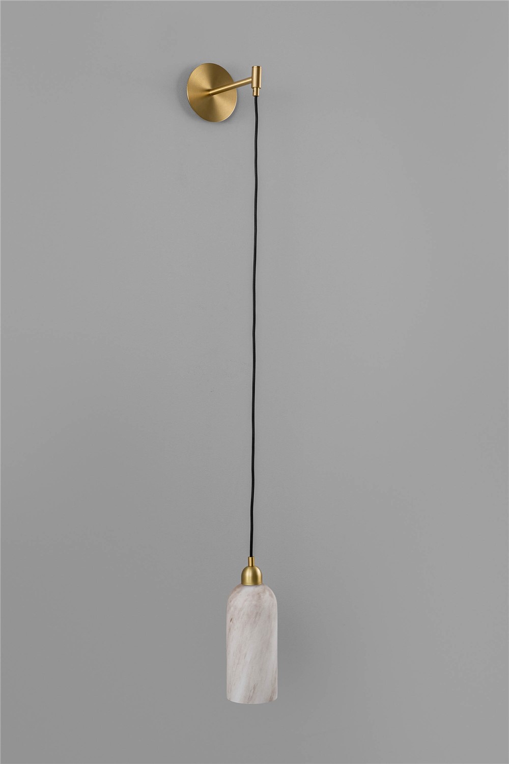 A Canto, from the Italian word for song, signifies a passage within a greater story.A suspension to divide, to steady the pace.This wall-mounted pendant takes in that sense of punctuation. Its solid brass arm extends outward, with a cord guiding a cylinder of glass to rest lightly in the air just shy of the wall.In Opal, Marble Matte, or Dries Ribbon, it settles in as a luminous focal point; a gentle cadence along the vertical surfaces of a room.