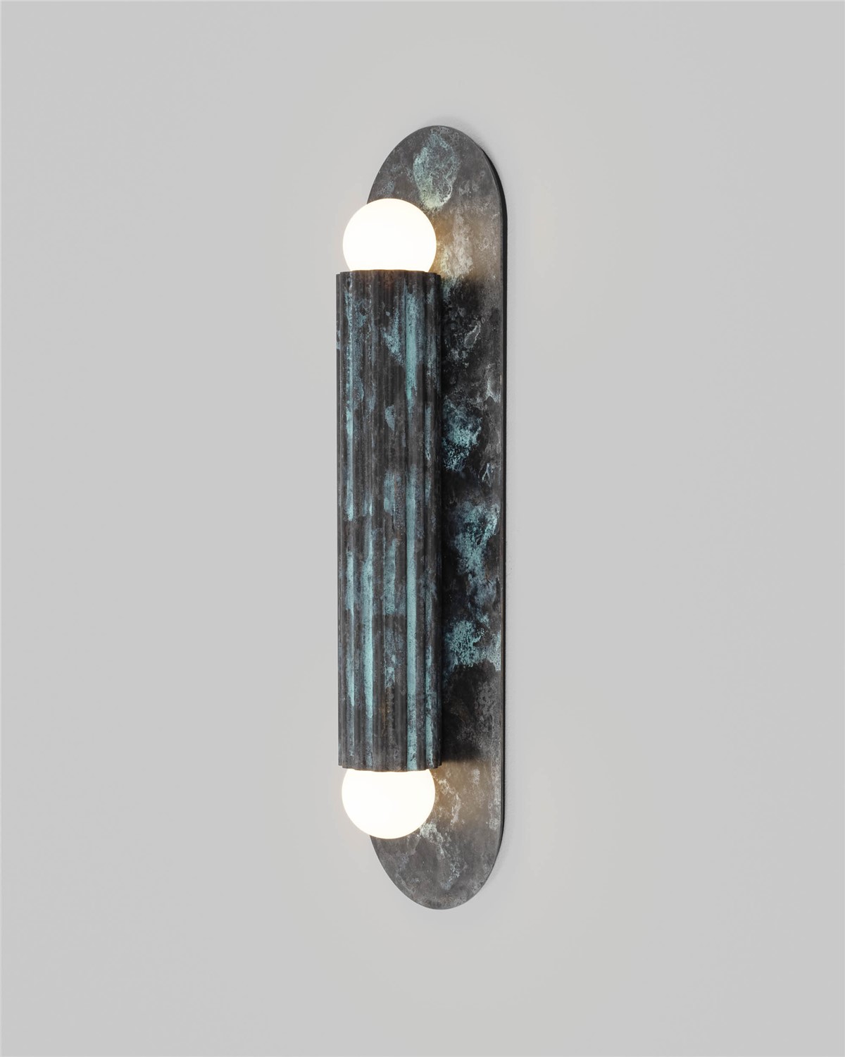 A single fluted cylinder rests on an oval plate, its geometry distilled to pure form. Entirely crafted in solid brass, it captures light as it ripples across the vertical lines, casting warmth, depth, and quiet intensity. Mounted as a wall sconce or flush fixture, it becomes a subtle guardian of atmosphere - architectural in presence, yet serene in glow.
