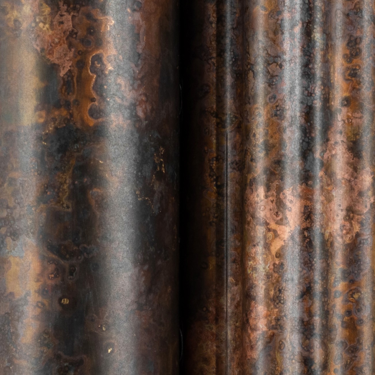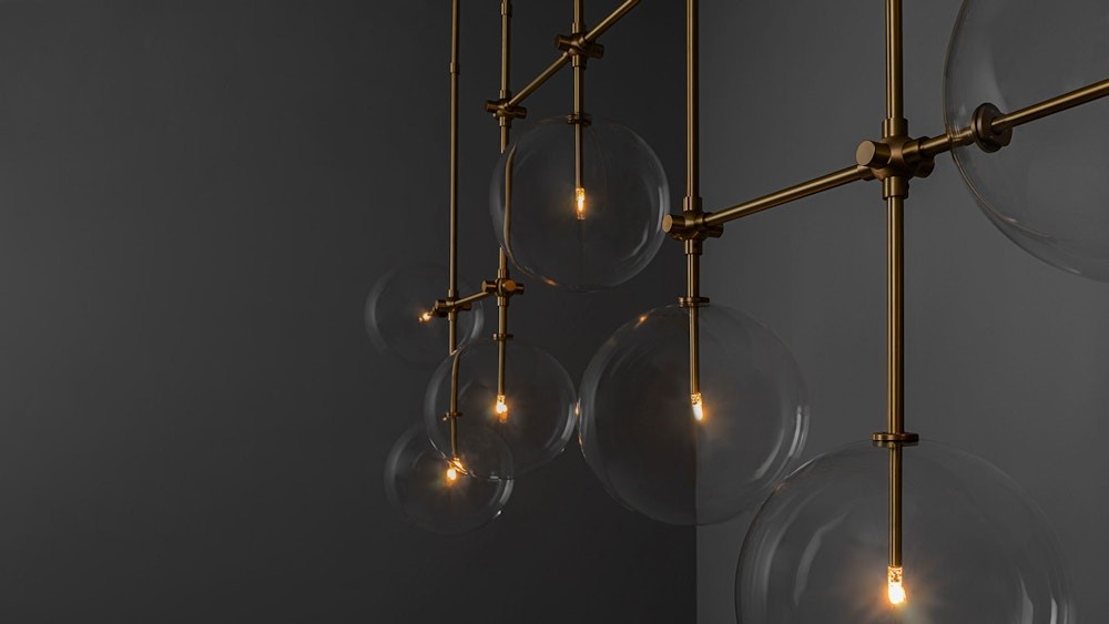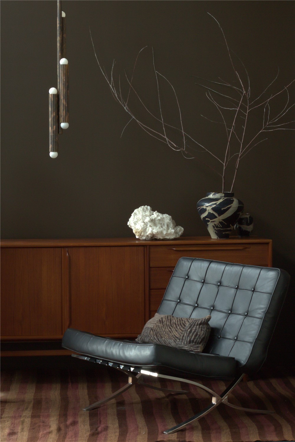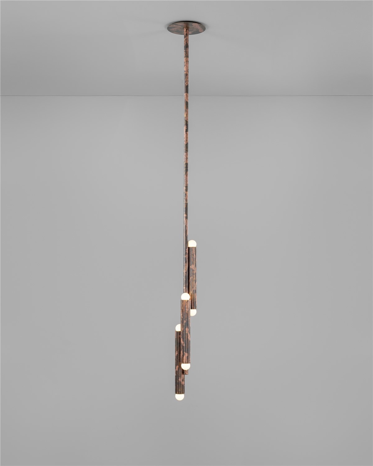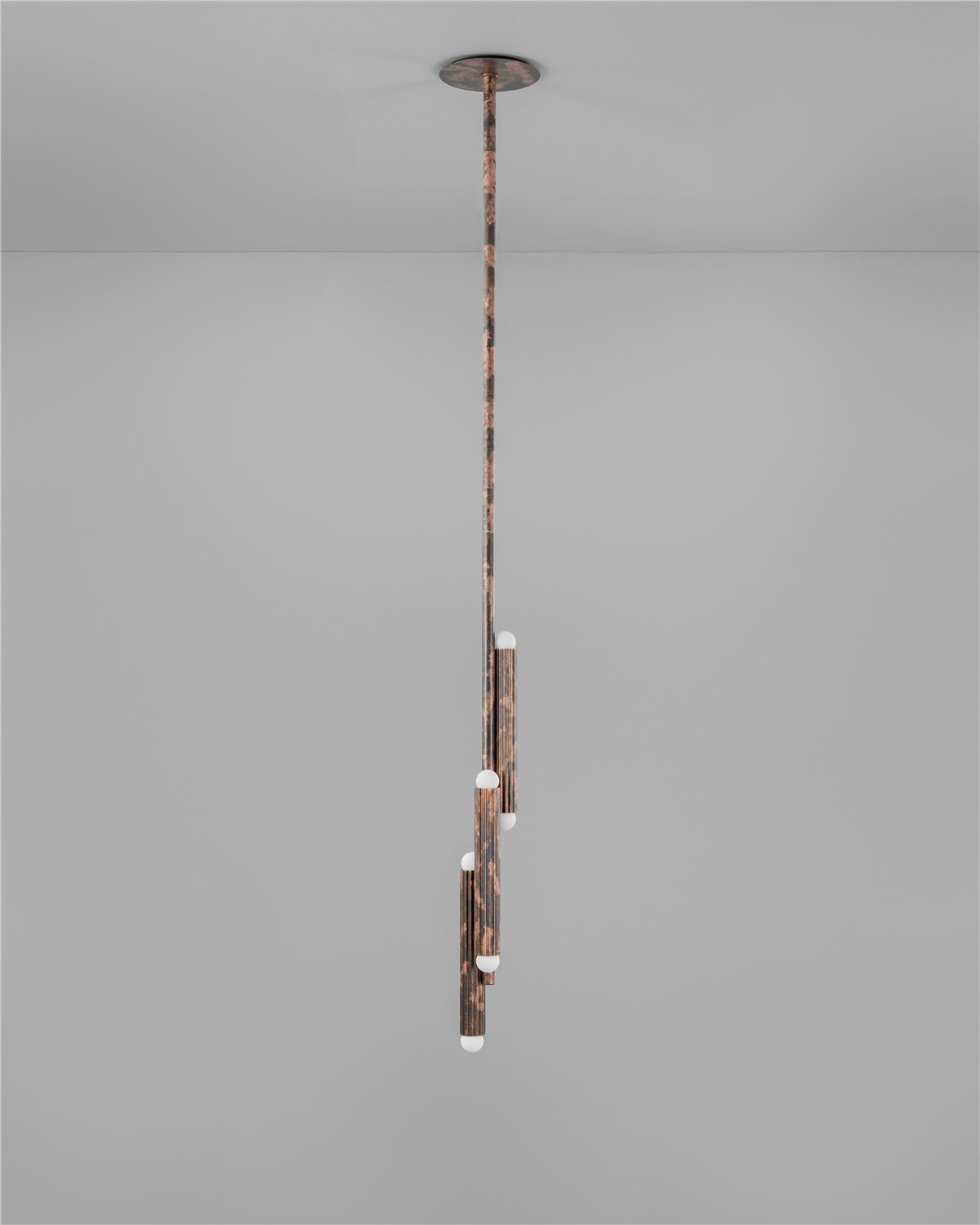 A cascade of three fluted cylinders descends from a linear axis, their rhythm hovering in space as light and shadow glide across the brass. Refined yet commanding, this pendant - entirely crafted in solid brass - brings depth and balance to both bold compositions and intimate settings.