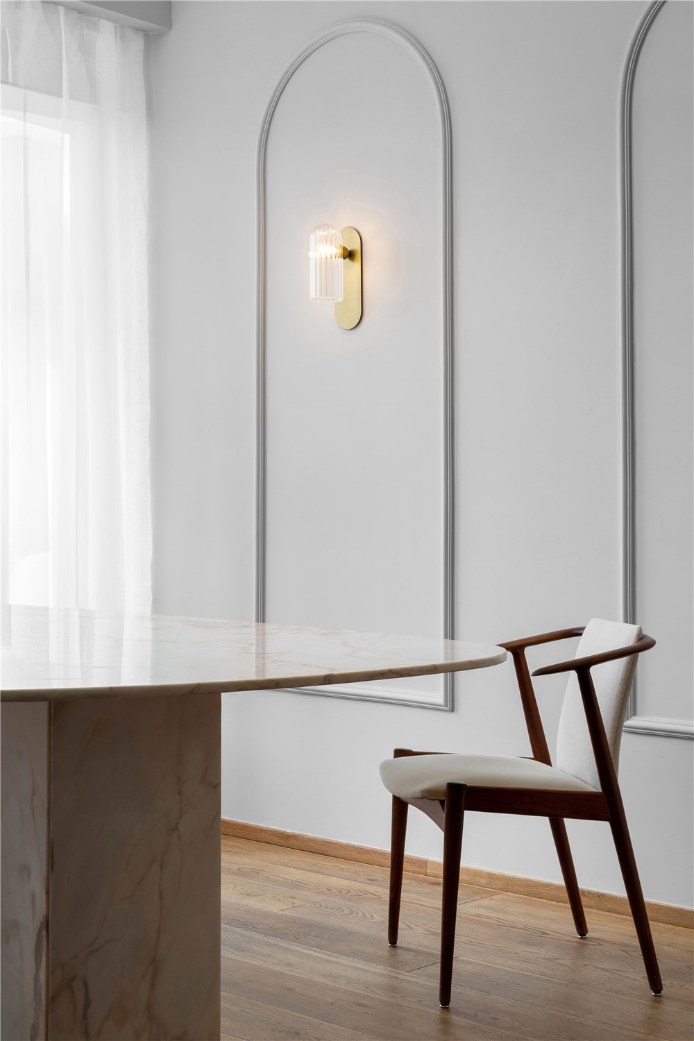 To display its graceful design, this illuminated fixture features a brass medium-sized plate seamlessly paired with a one-sized glass arched cloche, crafted from break-resistant borosilicate glass.