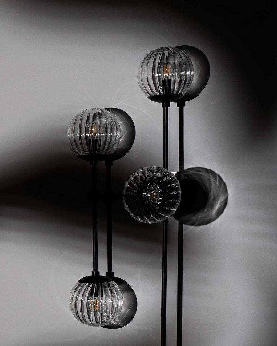 Armstrong 6 captures a sense of movement. Forms connect with spontaneous energy, punctuated by glass spheres. Linear elements compliment the carefully crafted brass, echoing a reinforced internal skeleton. The flush mount base gives this lamp special adaptability, a wall-mounted statement, or a compact chandelier.