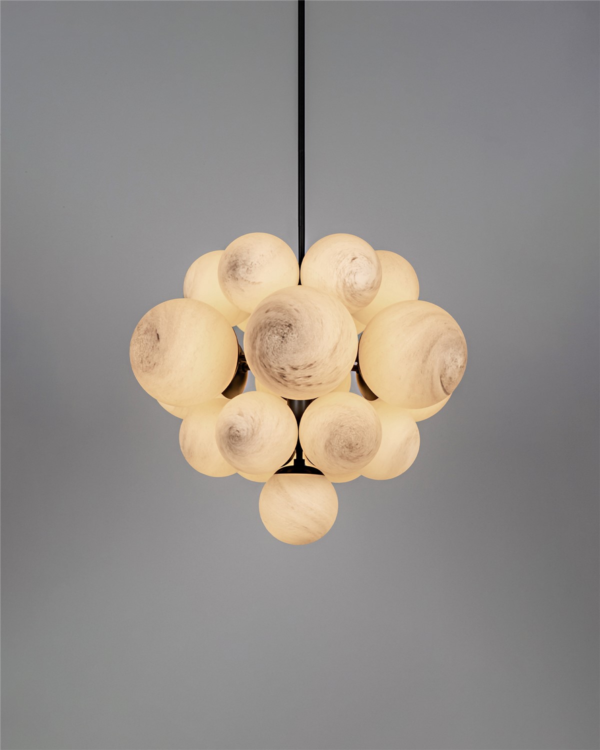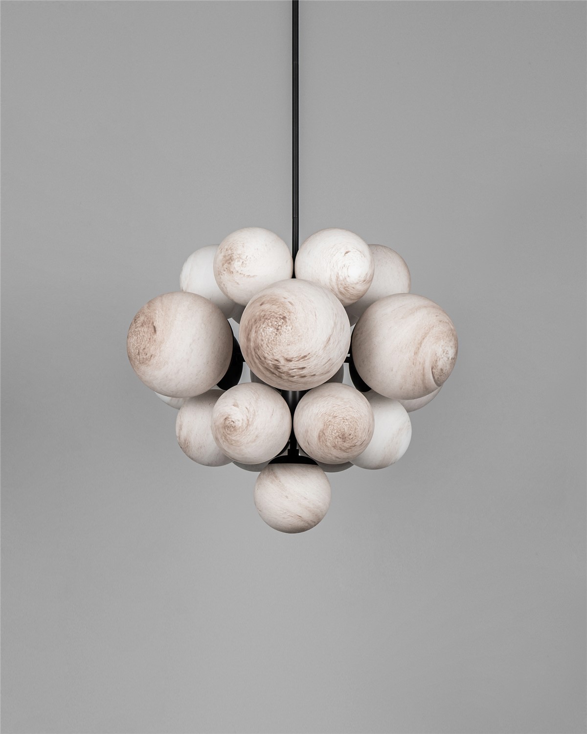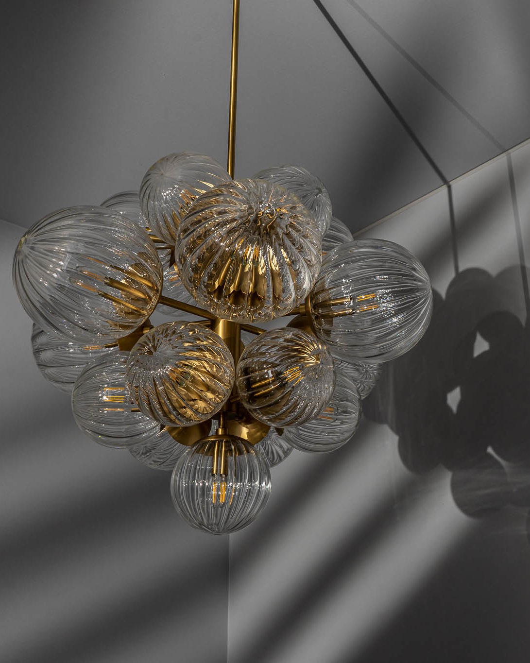 An effervescent cluster of glass spheres cumulates around a pendant brass frame. Majestic and modern, the composition invites a gestalt perspective shift when glimpsed from different angles: from side-on, a stellar cluster; from below, a single six-pointed star.