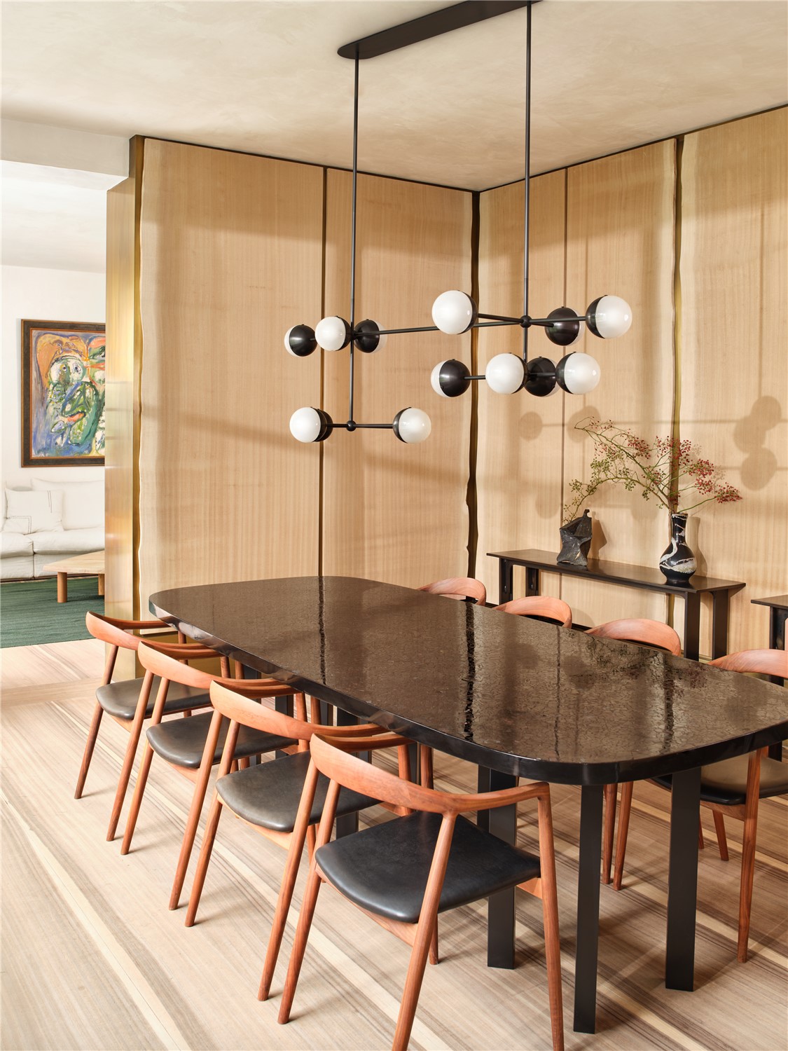 A fashionable line of enclosed bulbs expands into a playful configuration of elemental proportions. This chandelier of electric light represents the unseen forces shaping our material world.