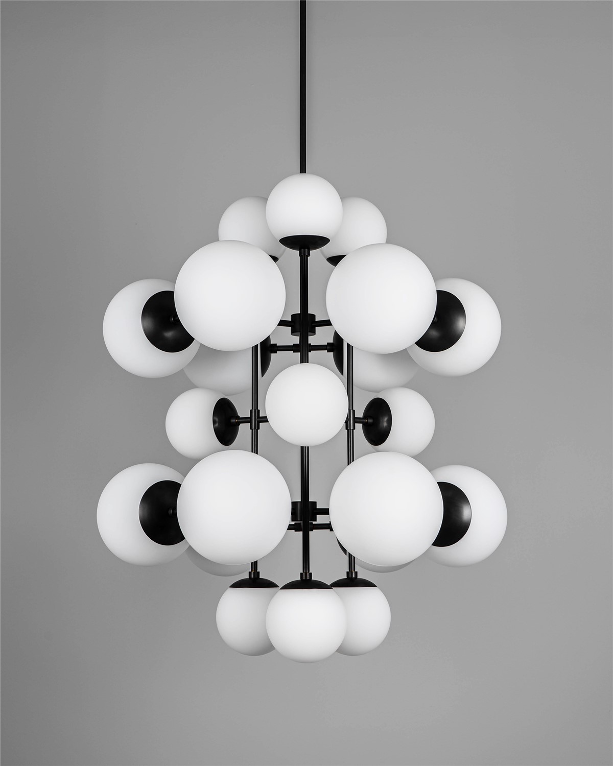 A kaleidoscope of glass spheres perambulates around a linear brass frame. Made with two sizes of glass globes, available in three types of signature glass, the shifting symmetries and enchanting interplay of configurations create changing patterns from every angle.