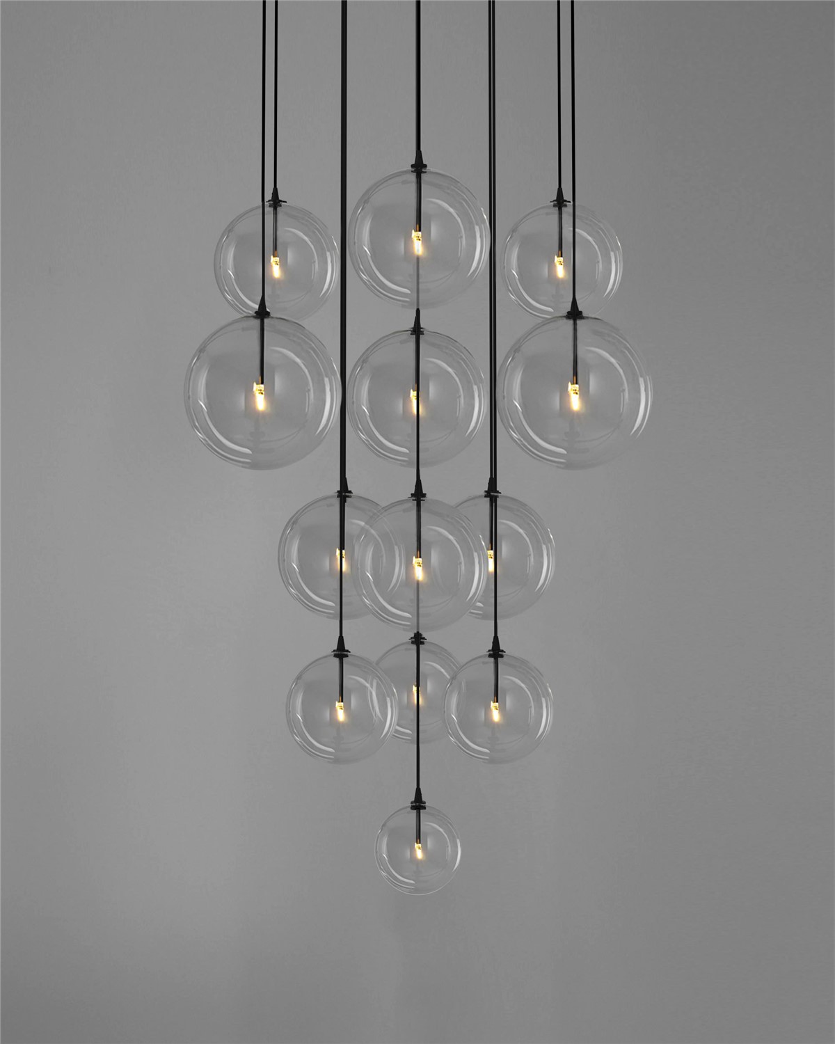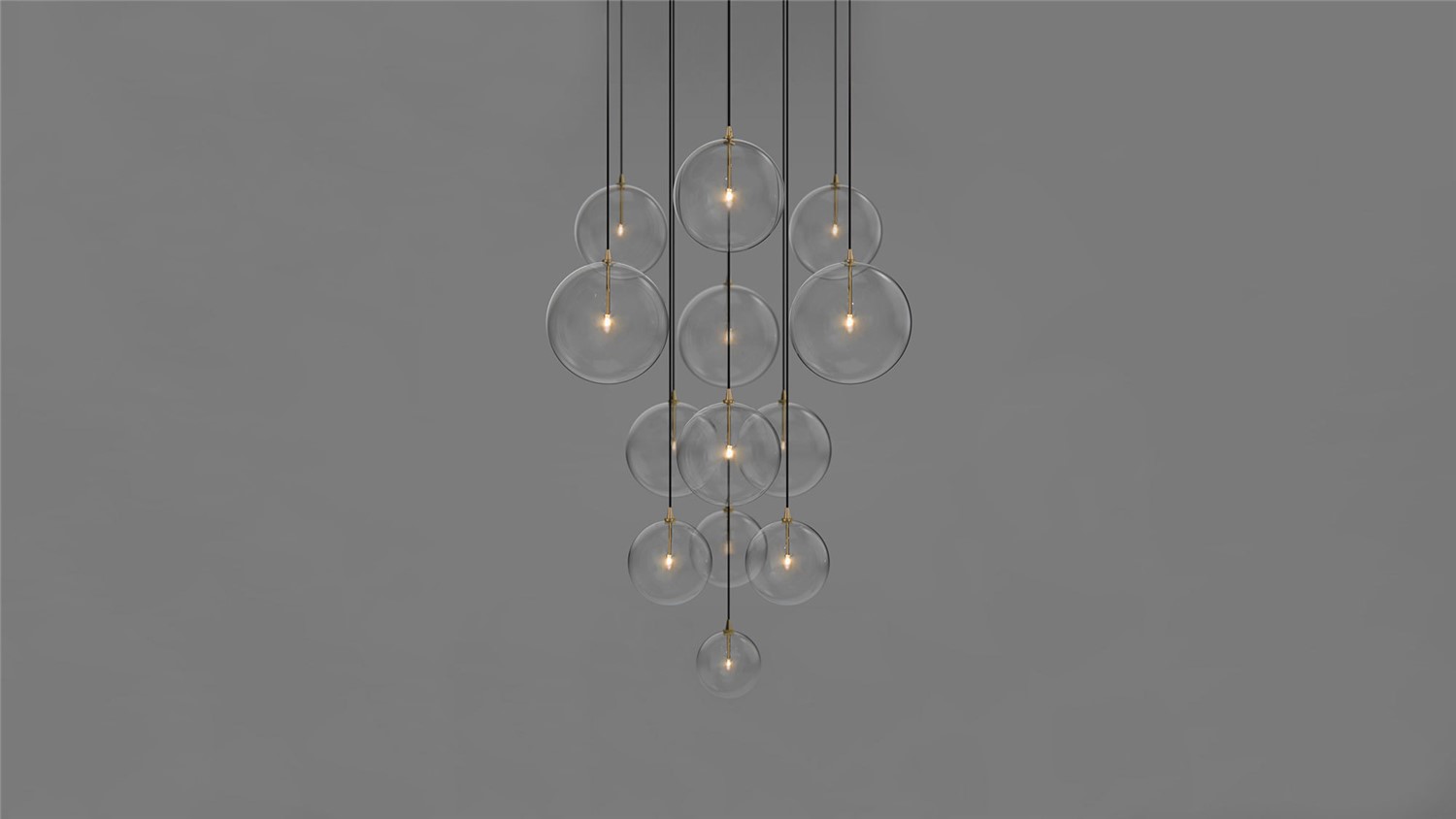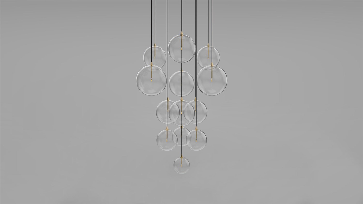 An arrangement of thirteen glass globes suspended from a discus of brass forms a serene ceiling constellation. A range of diameters creates the impression of a flock of spontaneous soap bubbles, floating in pyramidal formation in the air.