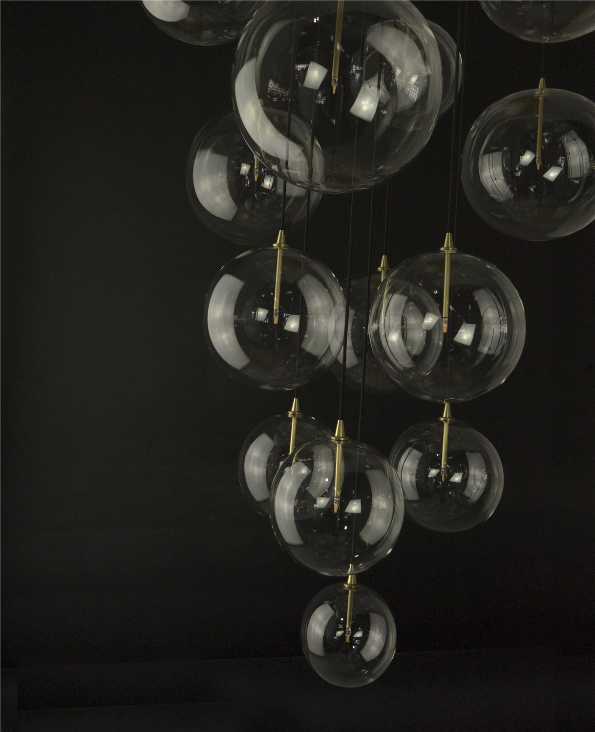 An arrangement of thirteen glass globes suspended from a discus of brass forms a serene ceiling constellation. The repeated sphere appears like a bundle of grapes, a tantalizing cluster floating in the air.