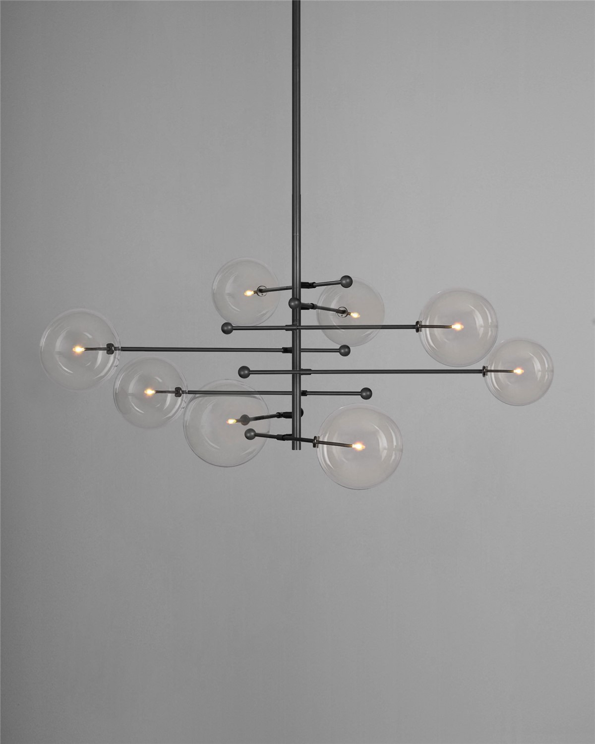 An octet of mouth-blown glass globes orbit a central axis, poised on adjustable cantilevered brass arms. The modular asymmetry of the intersecting angles forms a gyroscopic composition, bringing an interstellar elegance to a space.