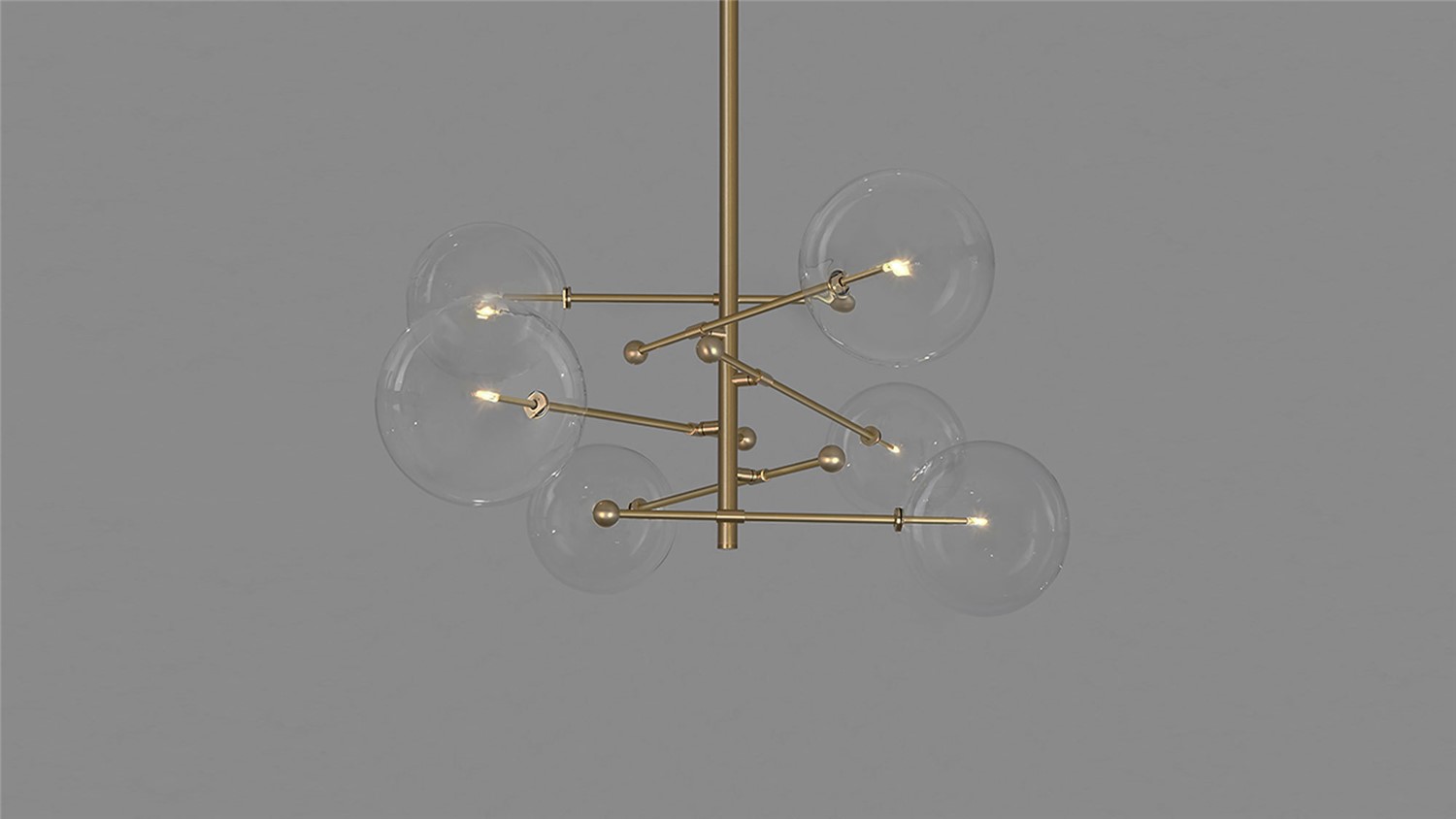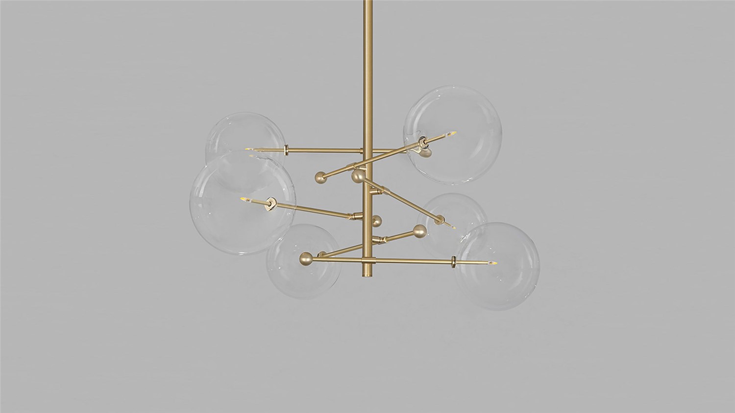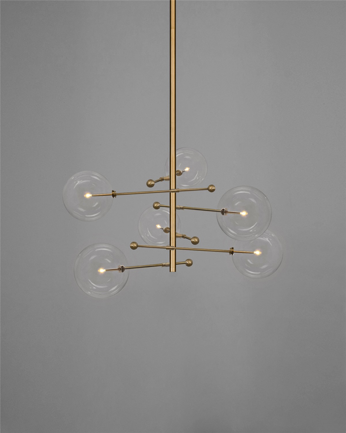 A sextet of mouth-blown glass globes orbits a central axis, poised on adjustable cantilevered brass arms. The modular asymmetry of the intersecting angles forms a gyroscopic composition, bringing an interstellar elegance to a space.