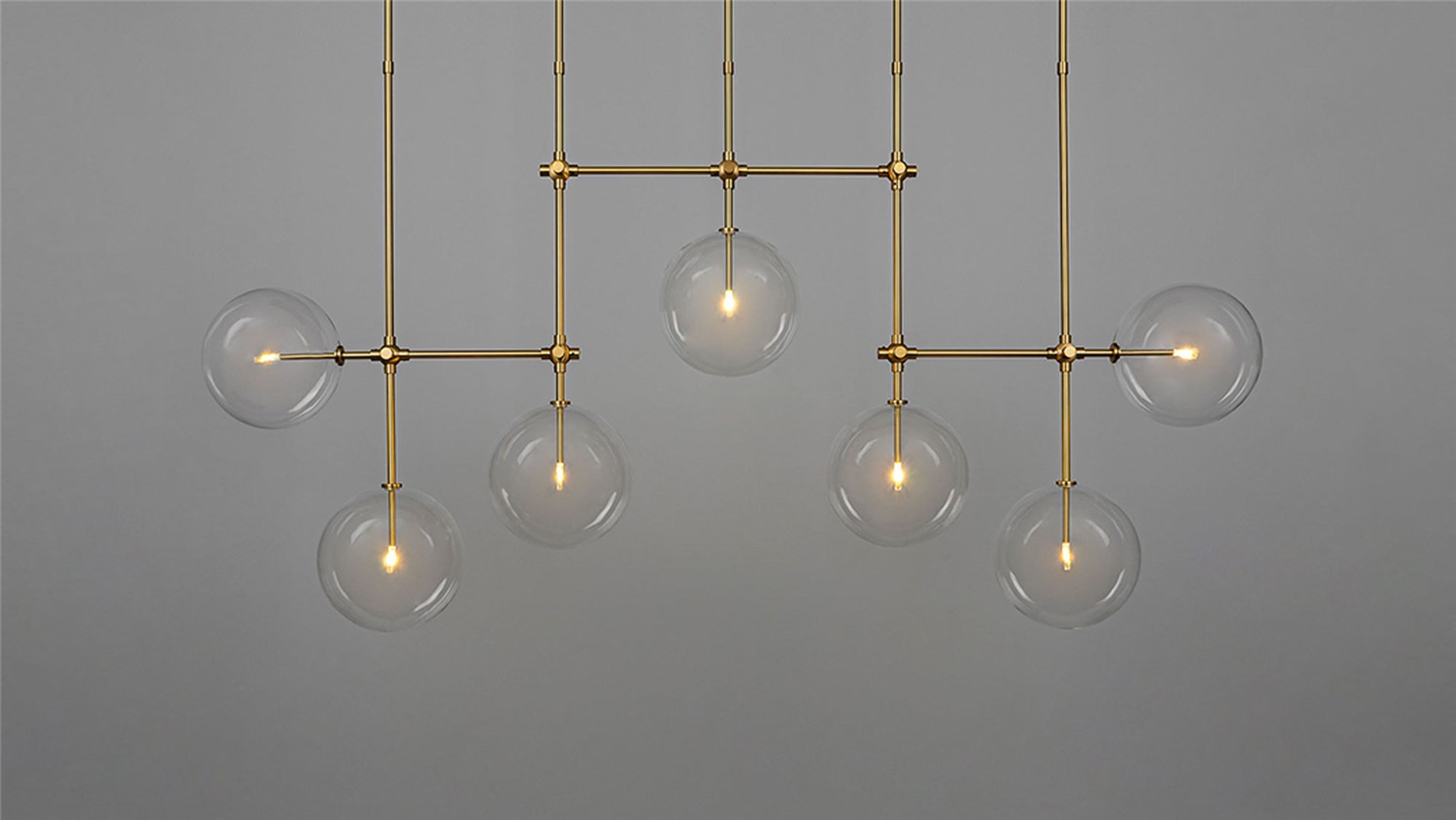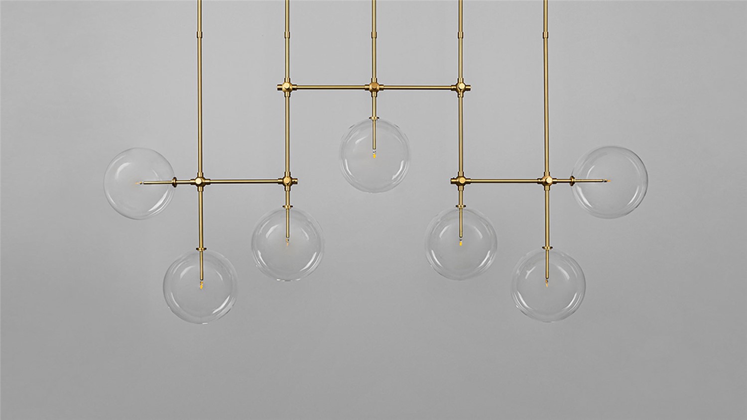 An array of ethereal glass globes floats weightlessly around a geometric lattice. The linear symmetry of the brass grid creates a covalent frame for the sparkling mouth-blown spheres.