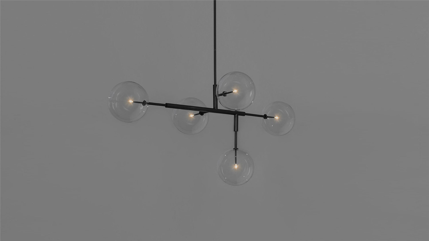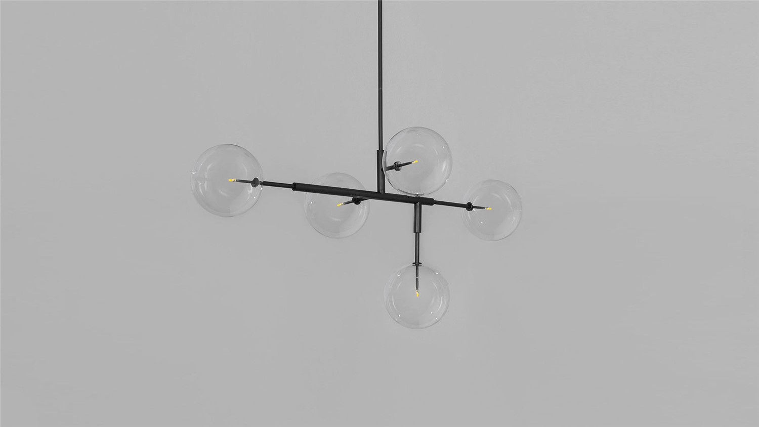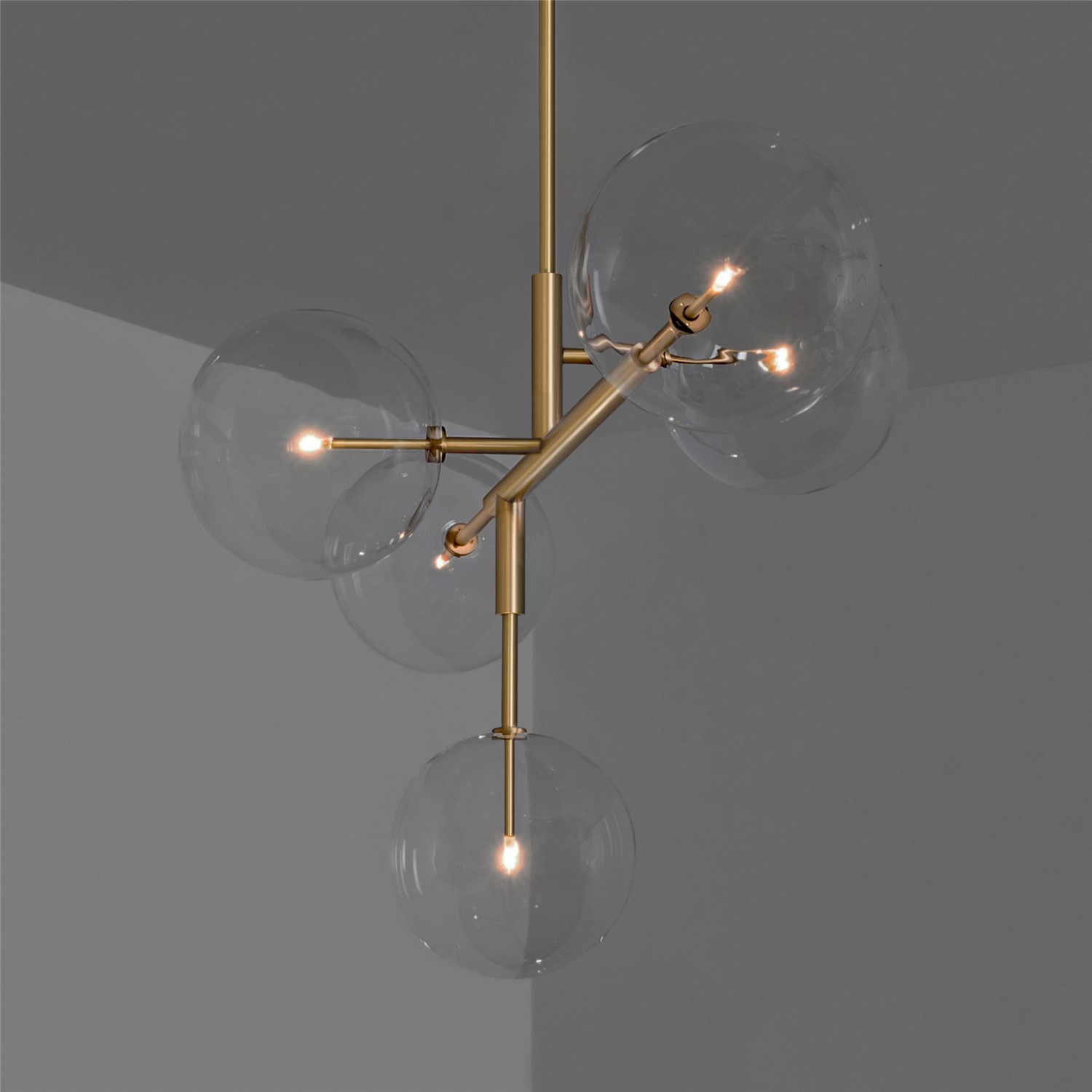 Five glass globes act as illuminated nodes upon a linear brass frame. A striking asymmetric geometry of clean right angles creates a contemporary fixture, a streamlined voyage.