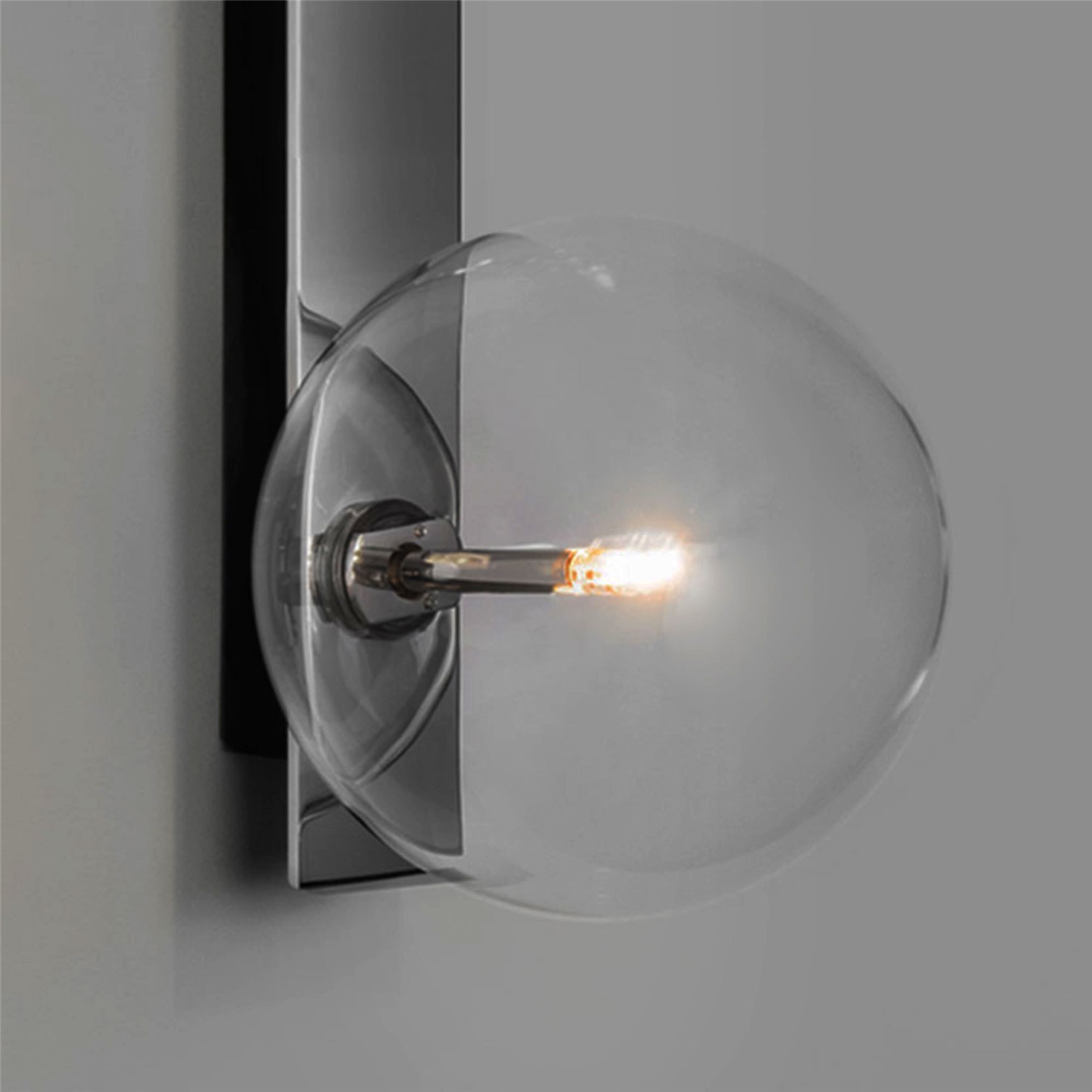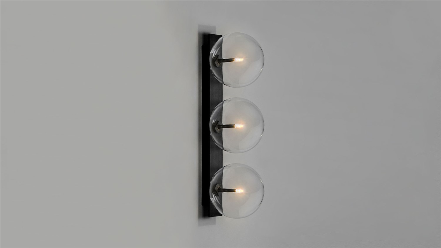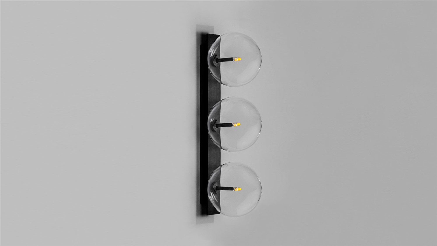 Three glass bubbles alight upon a slender rectangle of brass for an essential design. Inspired by the sober compositions of mid-20th century Norwegian artist Ragnhild Keyser, the unique surface curvature of the mouth-blown globes lends a subtle optical distortion to minimalist lines.