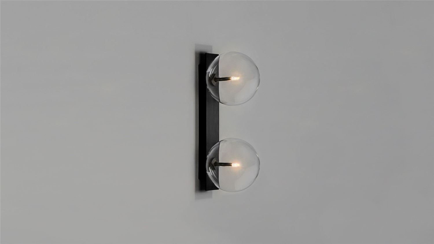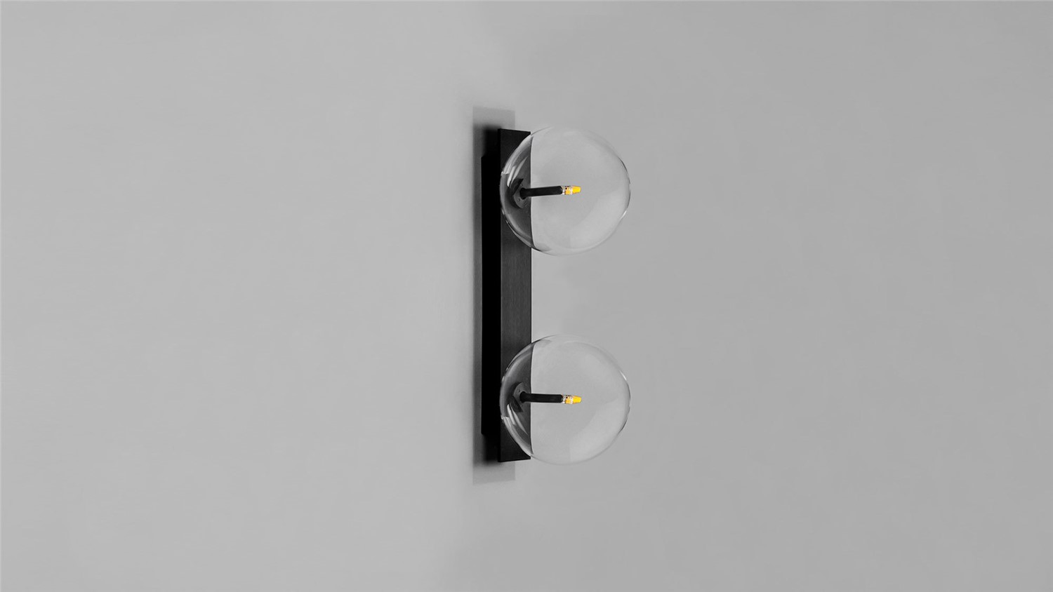 Glass bubbles alight upon a slender rectangle of brass for an essential design. Inspired by the sober compositions of mid-20th century Norwegian artist Ragnhild Keyser, the unique surface curvature of the mouth-blown globes lends a subtle optical distortion to minimalist lines.