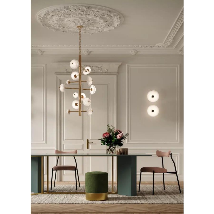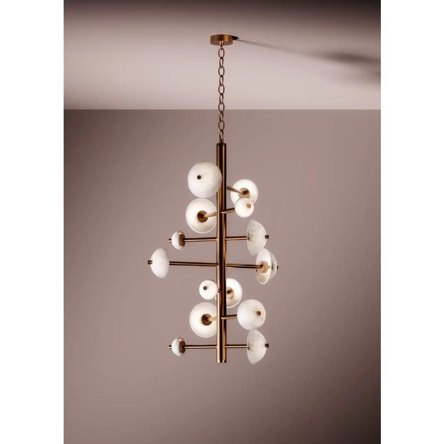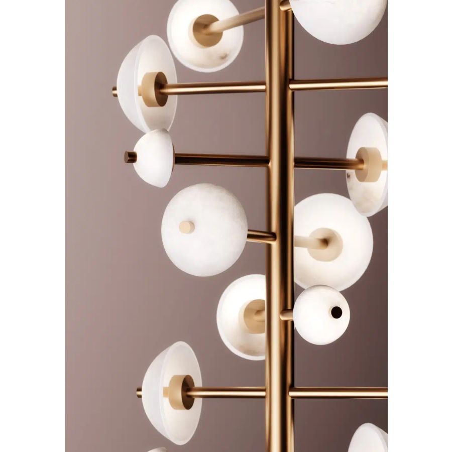 Alabaster domes of varying diameters and tubular elements of varying widths lend dynamism to this exclusive piece, maintaining a perfect balance of style. Named Apollo after the Greek god who pulled the sun chariot, the series draws inspiration from this peculiarity; a metal structure supports a series of luminescent hemispheres.
