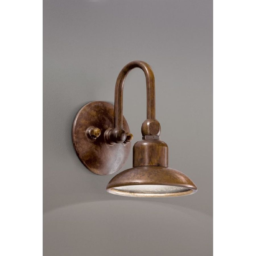 Serie av väggmonterade utomhuslampor med liten eller stor rund bas och en eller två lampor, mässingsbas och arm och kopparreflektor, finns i åldrad mässingsfinish.