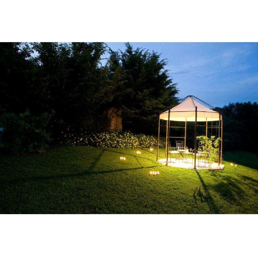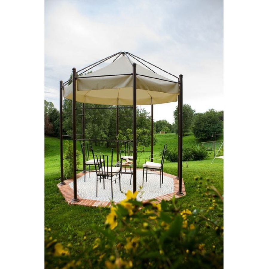 Det kan täckas med en baldakin, klätterväxter eller indiska draperier. Det levereras med alla tillbehör som behövs för enkel förankring i gräsmattan, även om det kan anpassas med trä, granit eller tegel. Lusthuset kan anpassas för att passa det tillgängliga utrymmet baserat på en design som överenskommits i förväg med kunden. Produkten levereras med belysningsarmatur inklusive glödlampa.