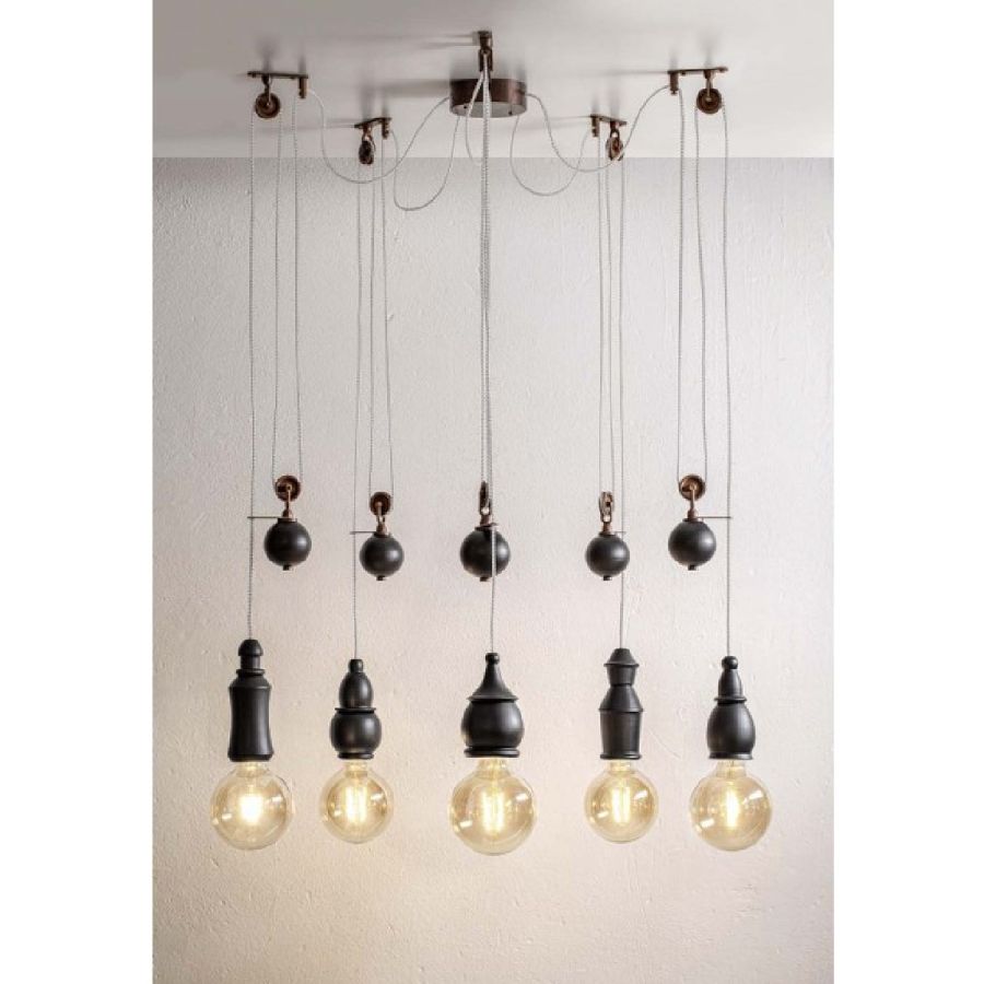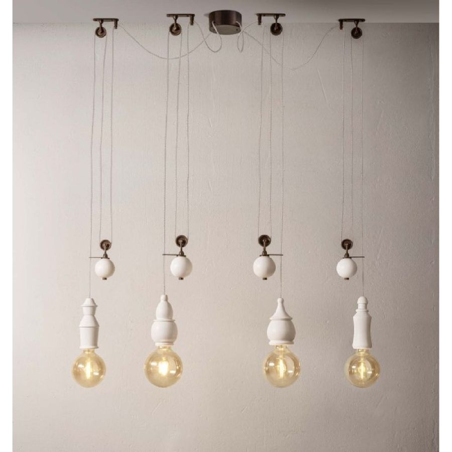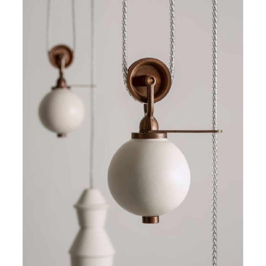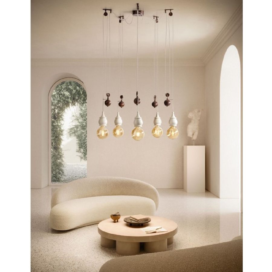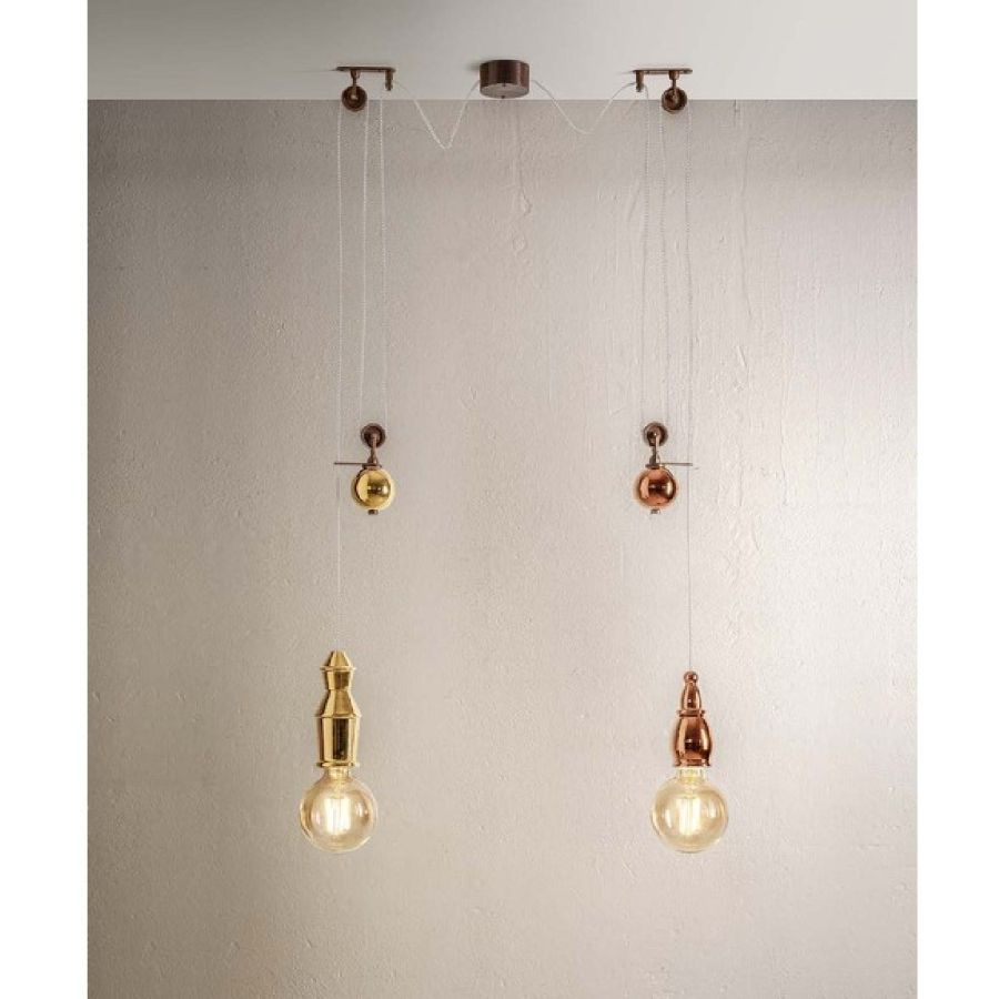 Aldo Bernardis senaste kollektion innehåller motviktspendlar med justerbar höjd, tillgängliga i antik mässing eller keramiska ytbehandlingar. Dessa pendellampor är utrustade med en trissa i antik mässing och levereras med en 3 meter lång transparent PVC-kabel.