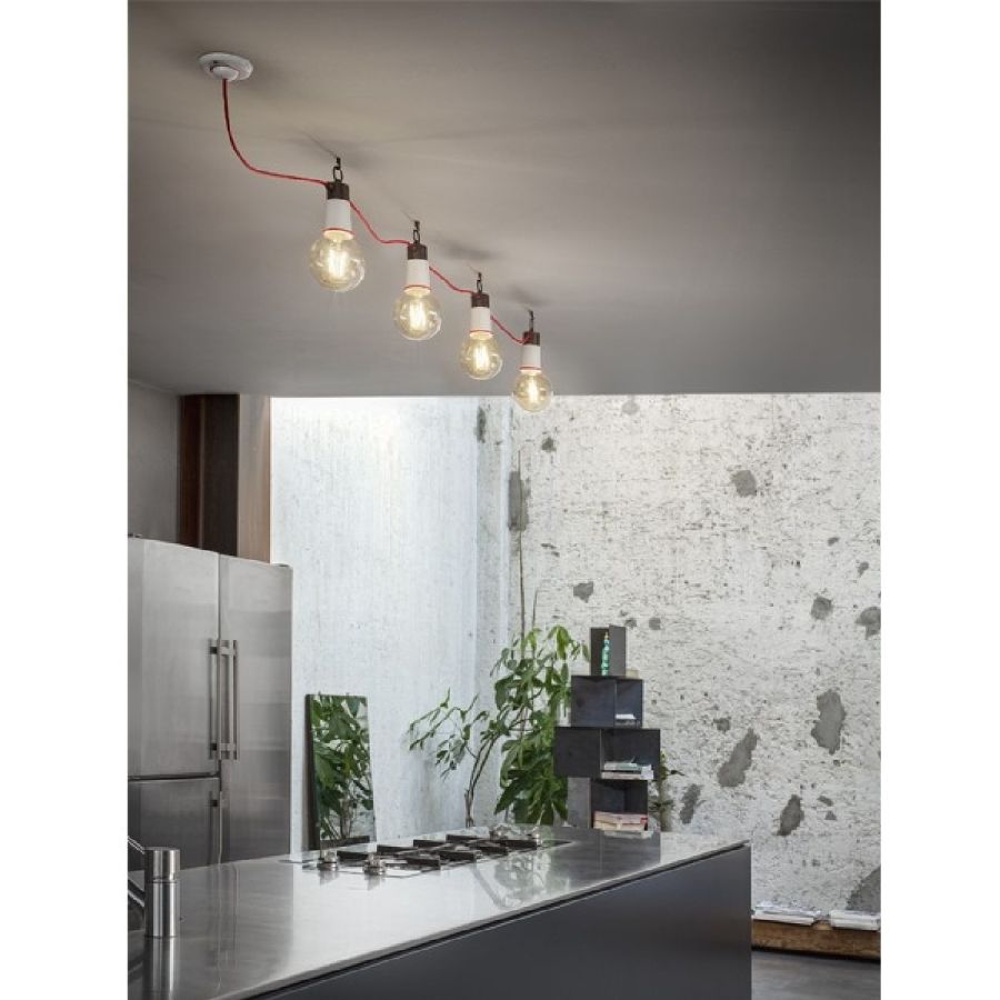 Pendeln består av en bas med krok i åldrad mässing och en keramisk lamphållarmodul som finns i högblankt vitt eller med färgad linjefinish. Kabeln, som beställs separat, finns i flera färger, att ange vid beställning.
