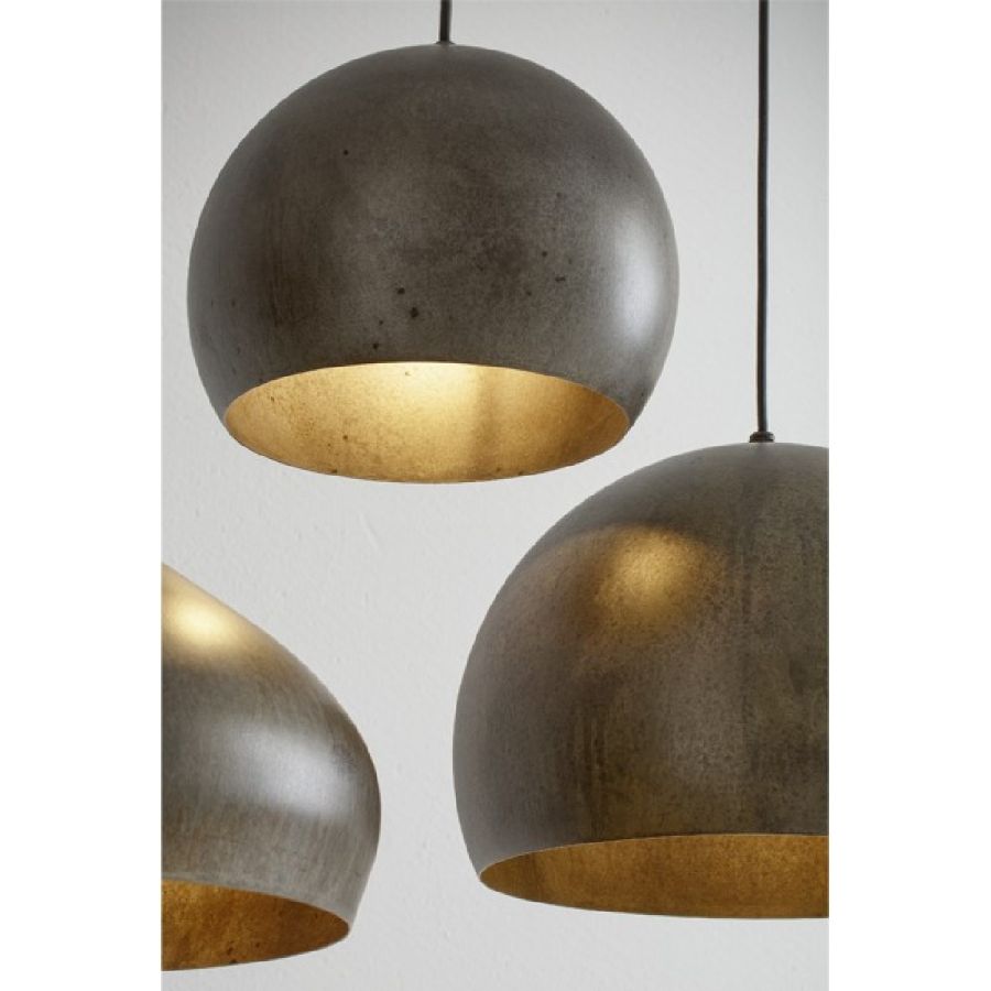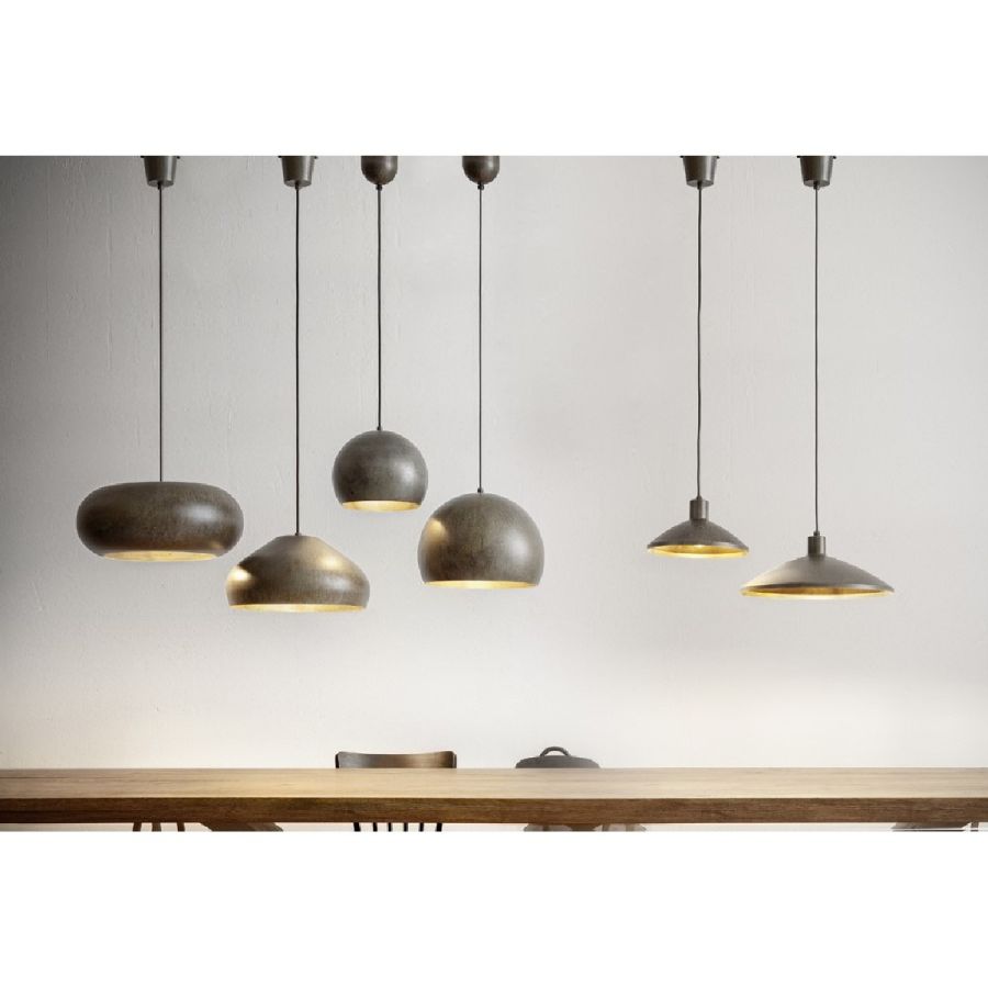 Serie med 6 pendlar i åldrat stål, med olika former och storlekar. Detta är en trevlig och praktisk lösning för inomhusbelysning, vardagsytor, effektiv även för att belysa bostadsutrymmen.