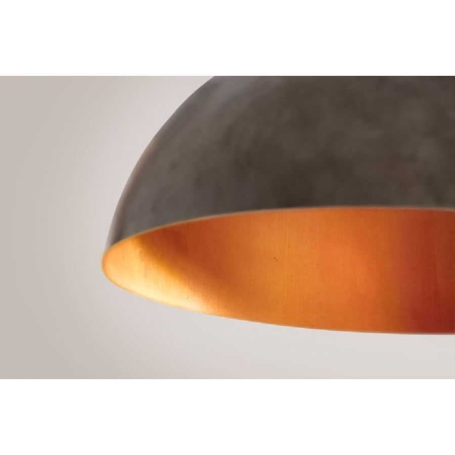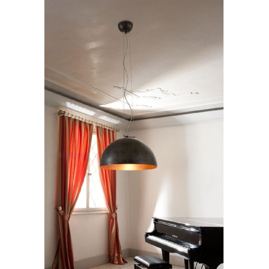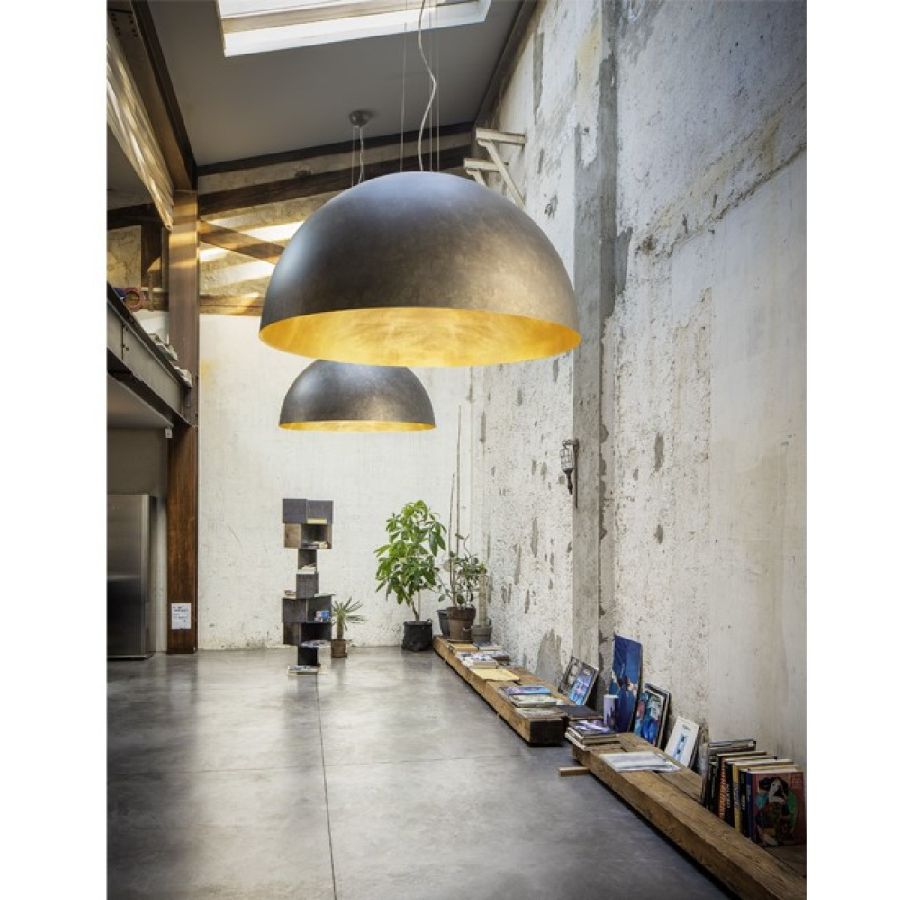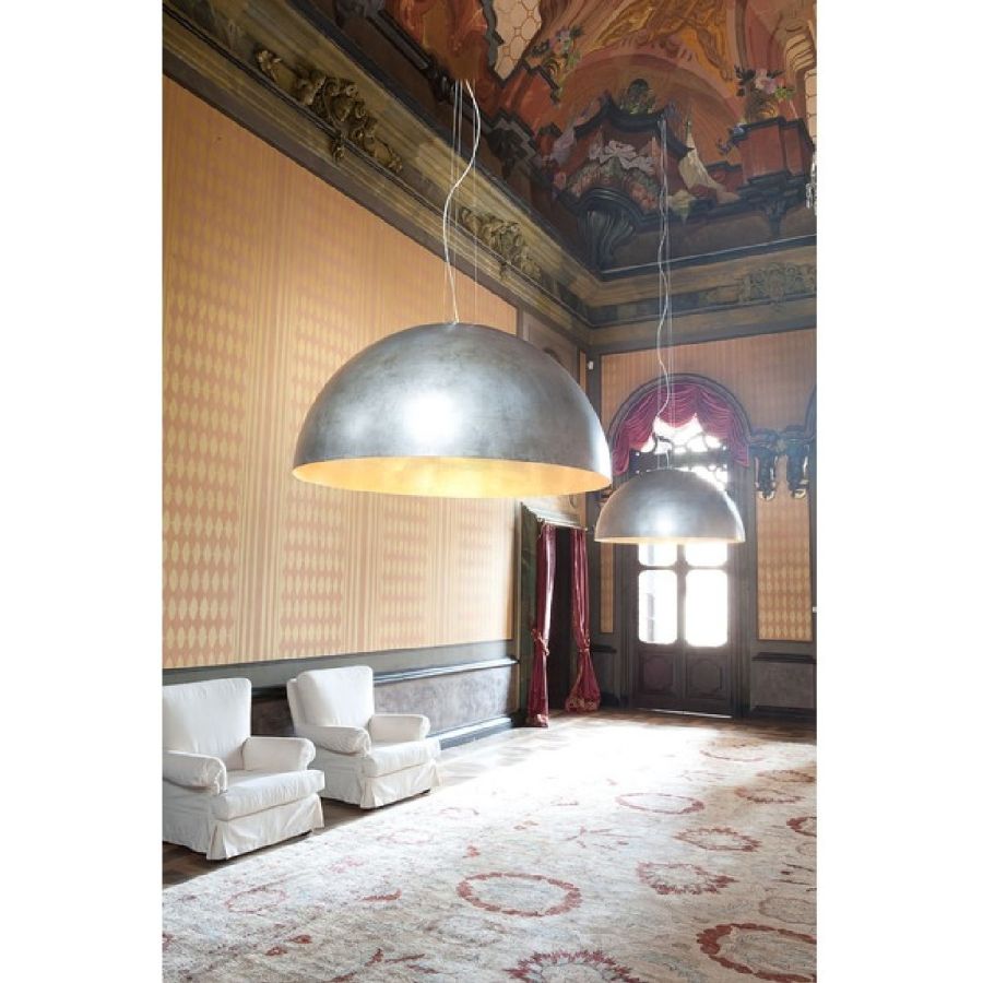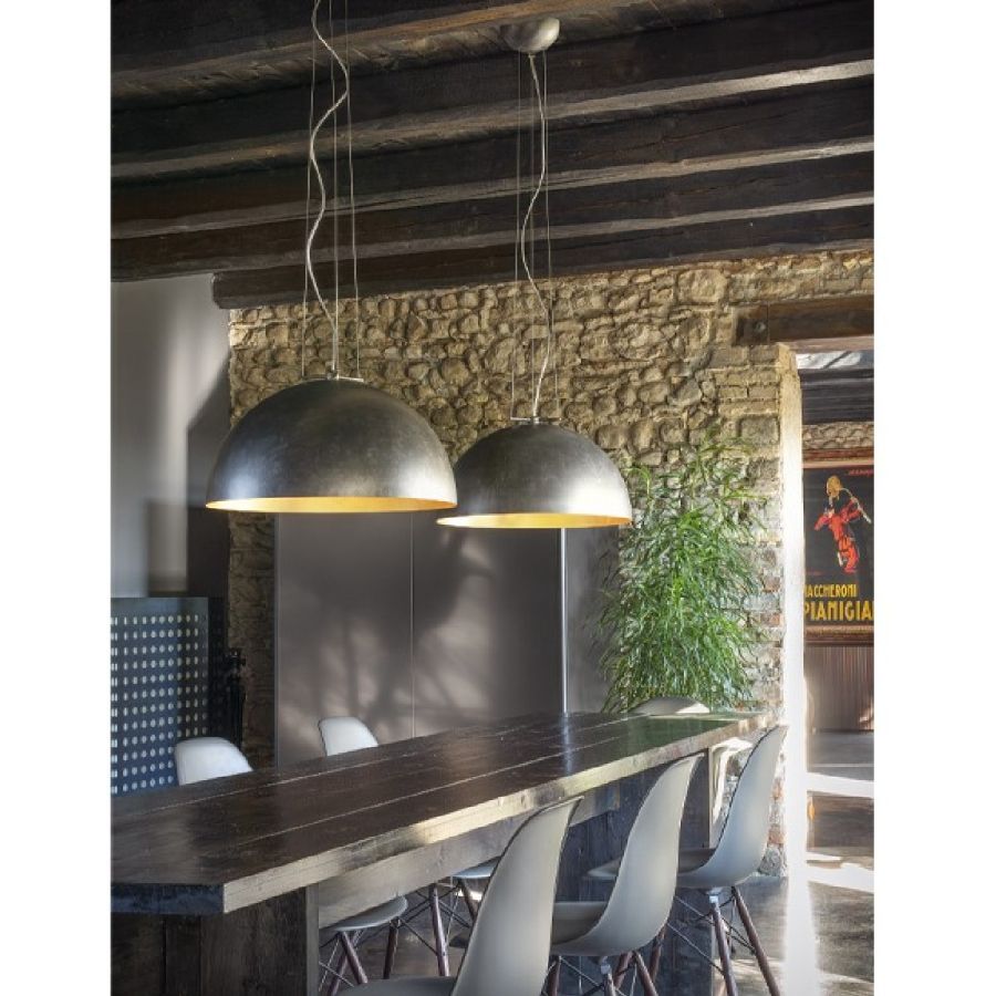 Serie av hemisfäriska stora hänglampor i stål med ett slående och glittrande intryck.