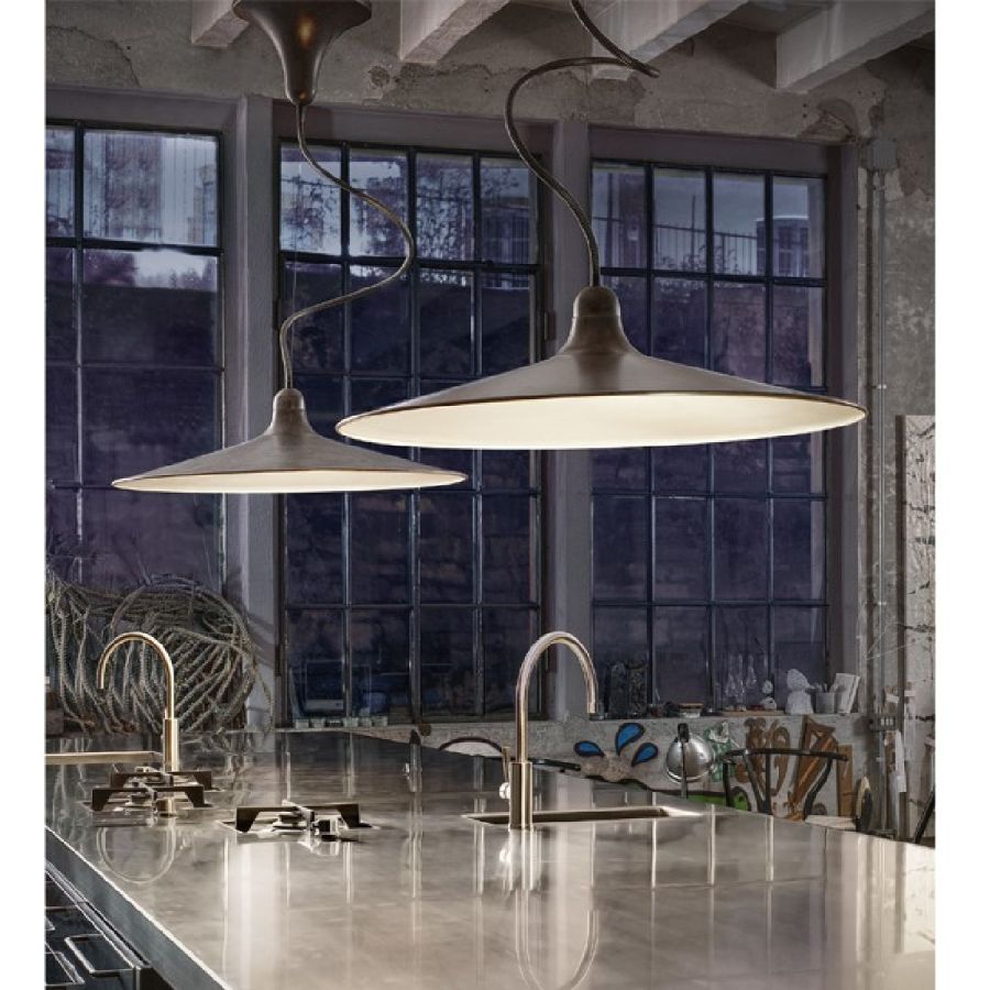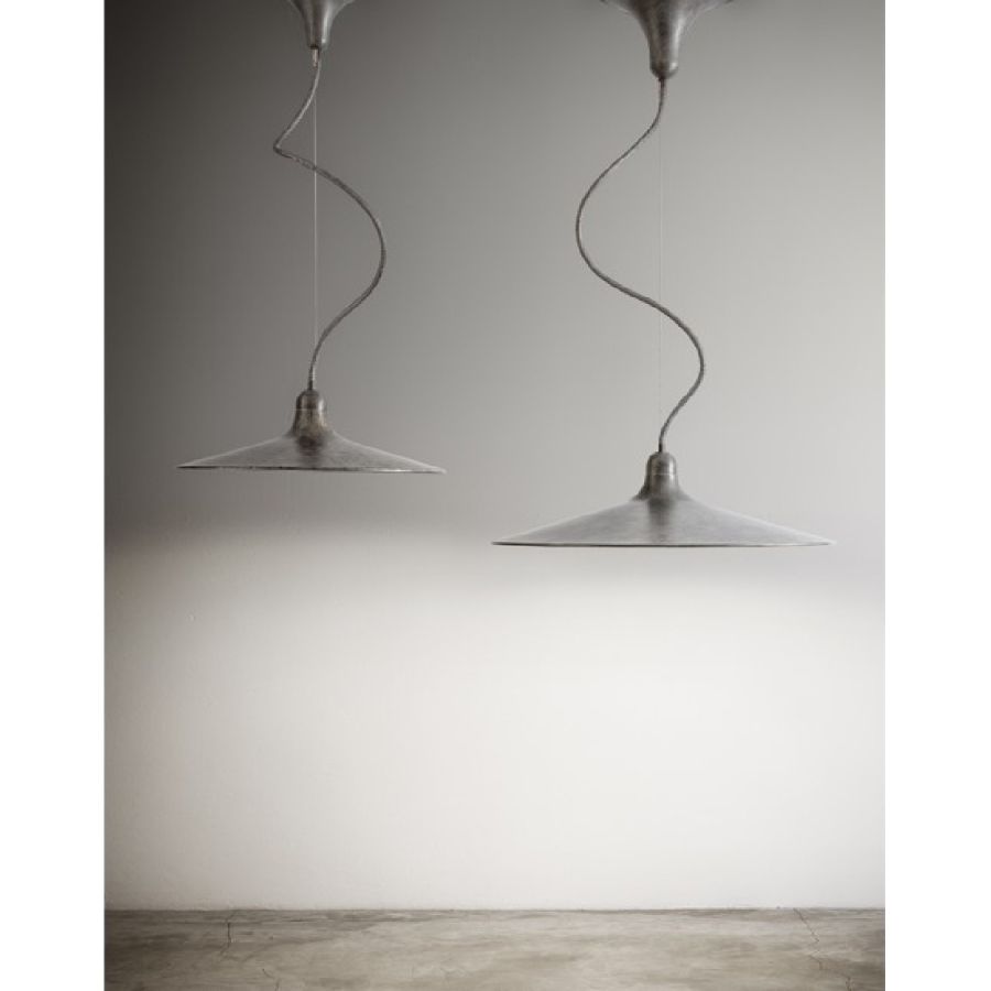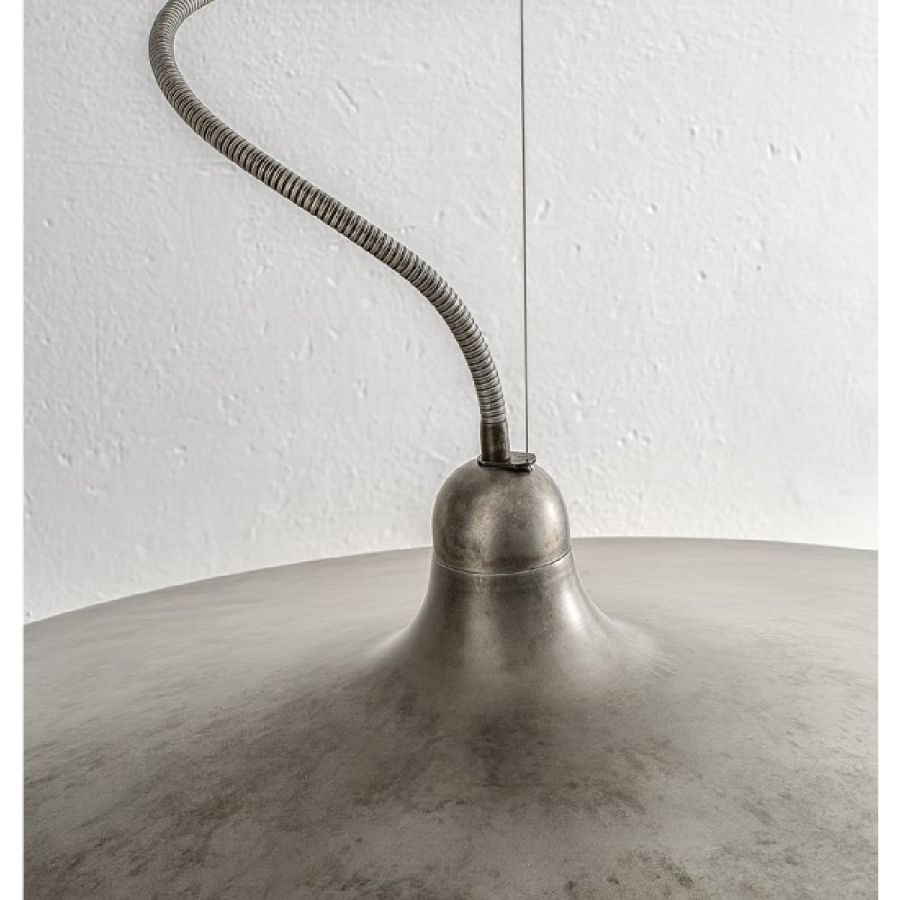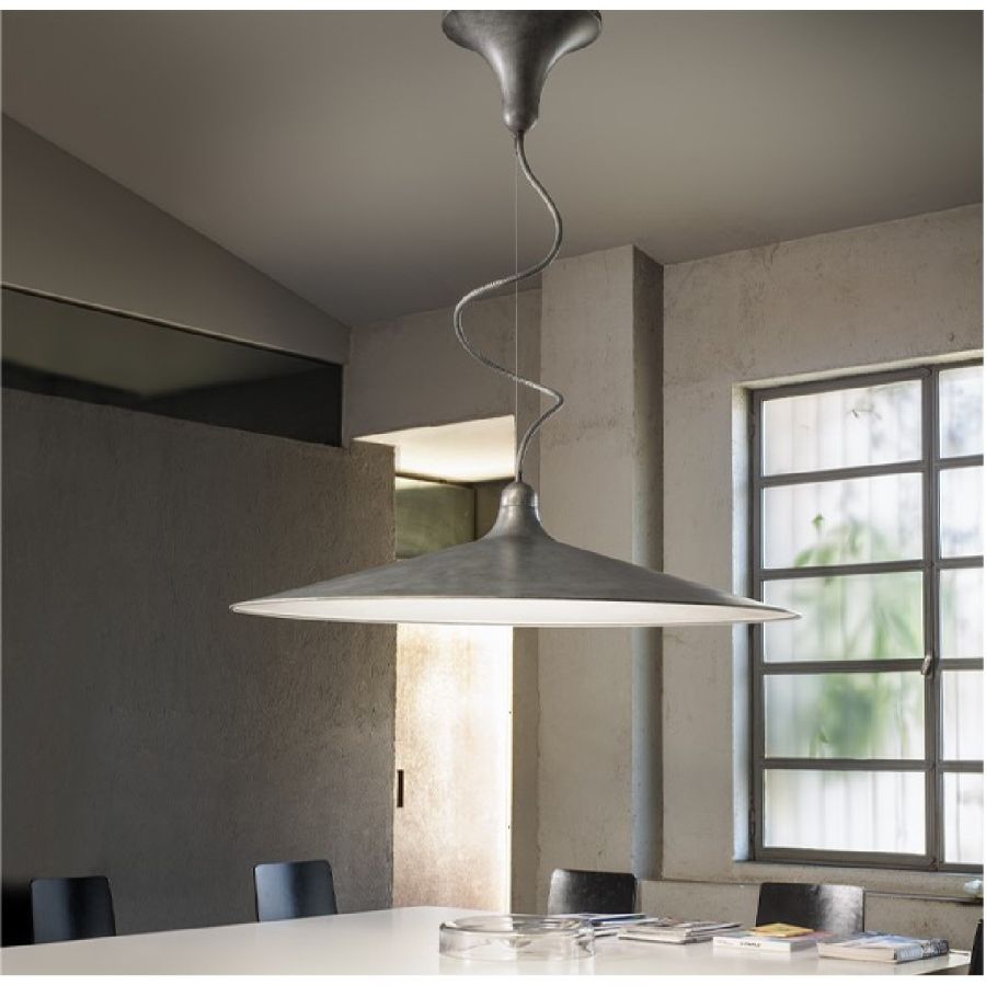 Serie av tre pendlar i olika storlekar som svarar mot samma koncept: att belysa rummet på ett funktionellt och högpresterande sätt och förhöja det. Idealisk för kontor, arbetsområden, gemensamma utrymmen både för kommersiellt och privat bruk. Den antika aluminiumytan förenar funktion och känsla. Pendlarna är utrustade med en enda metallkabel i rostfritt stål som möjliggör höjdjustering vid installation. Det flexibla centrala röret tillåter en lätt rotation av reflektorn till en position som även kan skilja sig från standarden.