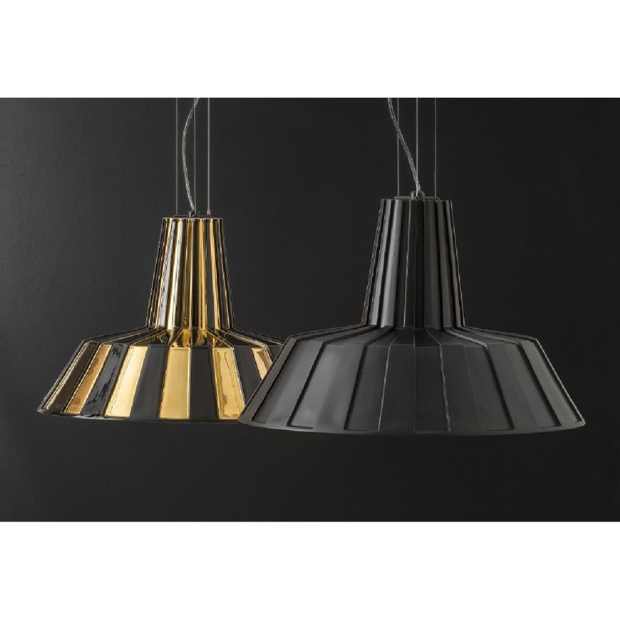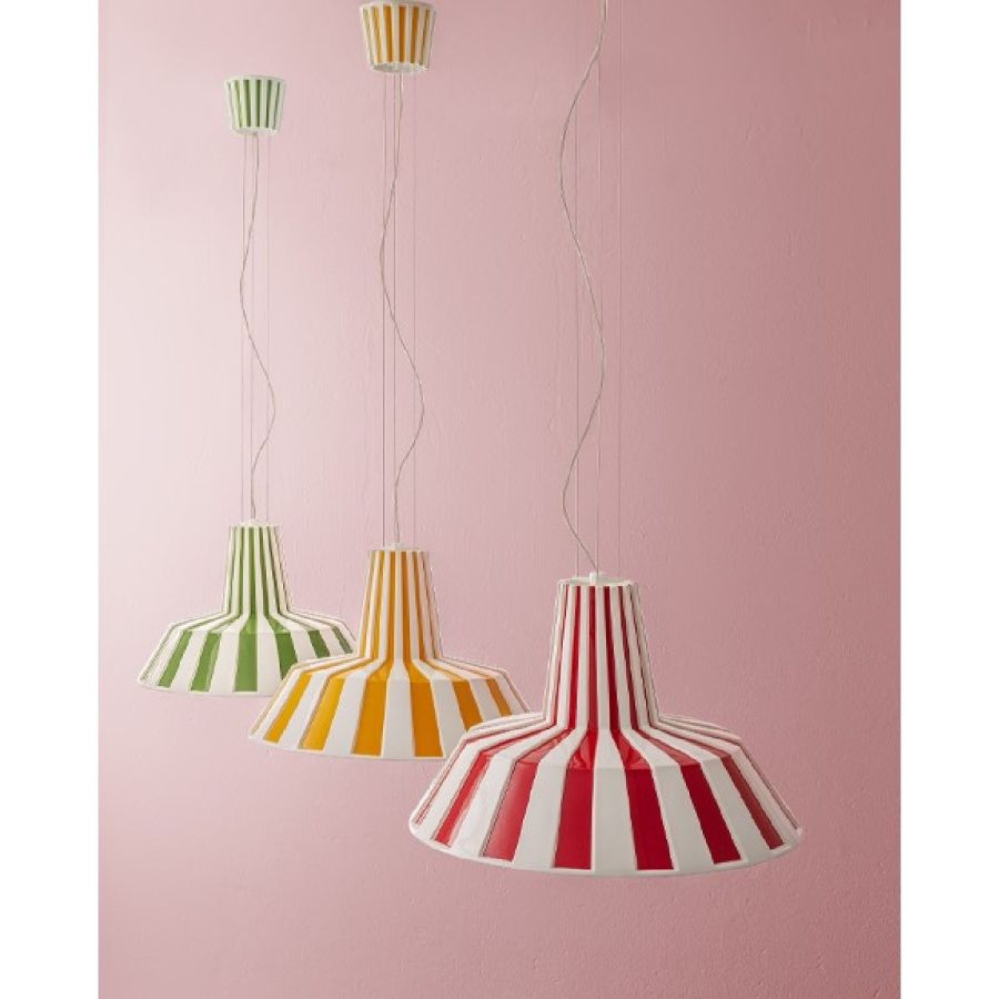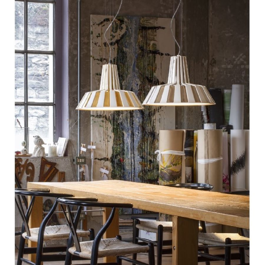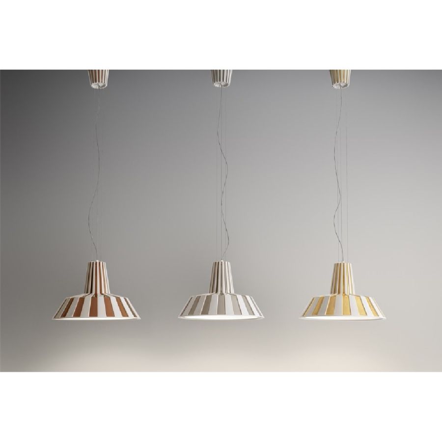 Designpendellampa i keramiska pendanter med reflekterande inre reflektor. Serien finns tillgänglig i enfärgat utförande eller med en original randig ytbehandling. Pendeln, både på grund av sin storlek och sin bearbetning, blir en originell möbel med en stark personlighet som definitivt inte går obemärkt förbi. Den är utrustad med kablar i rostfritt stål, vilka möjliggör höjdjustering vid installation.