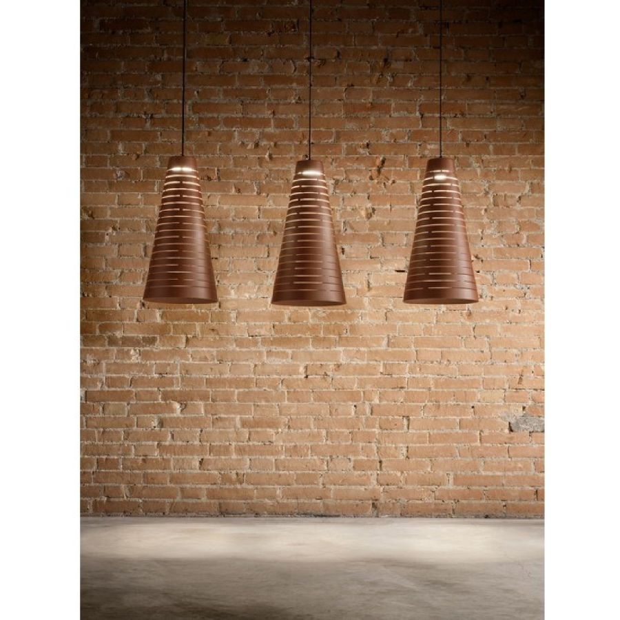Takpendel i en elegant konisk form i emaljerat stål. Ljuset som filtrerar genom horisontella sprickor skapar ett behagligt rutnät av ljus och skuggor. Lätthet och mångsidighet gör denna lampa till en trevlig ljuslösning.