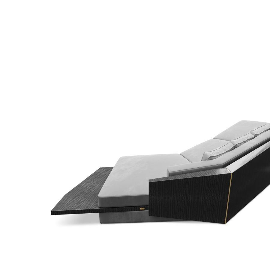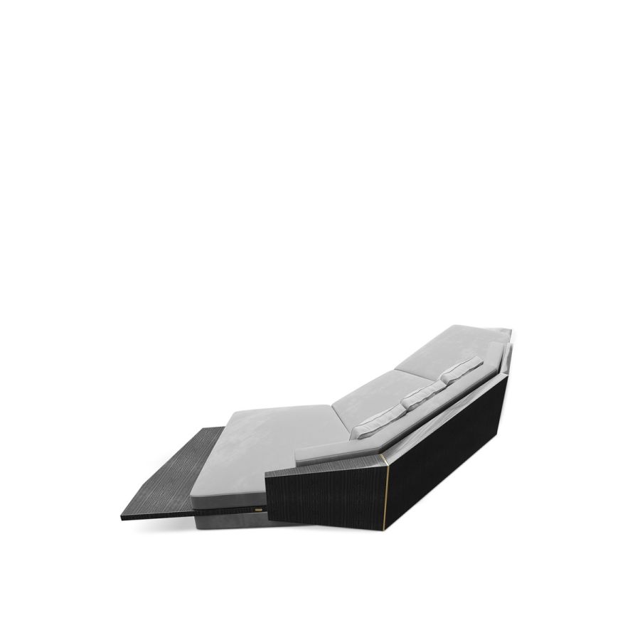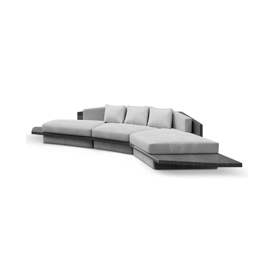 With premium materials such as glossy Eucalyptus Frisé Veneer, polished brass, and grey velvet, the Algerone Angular Sofa gives a modern allure to any living room design with its peculiar organic shape. The concept of comfort acquires a new dimension with a luxury aesthetic epitomized in this upholstery solution.