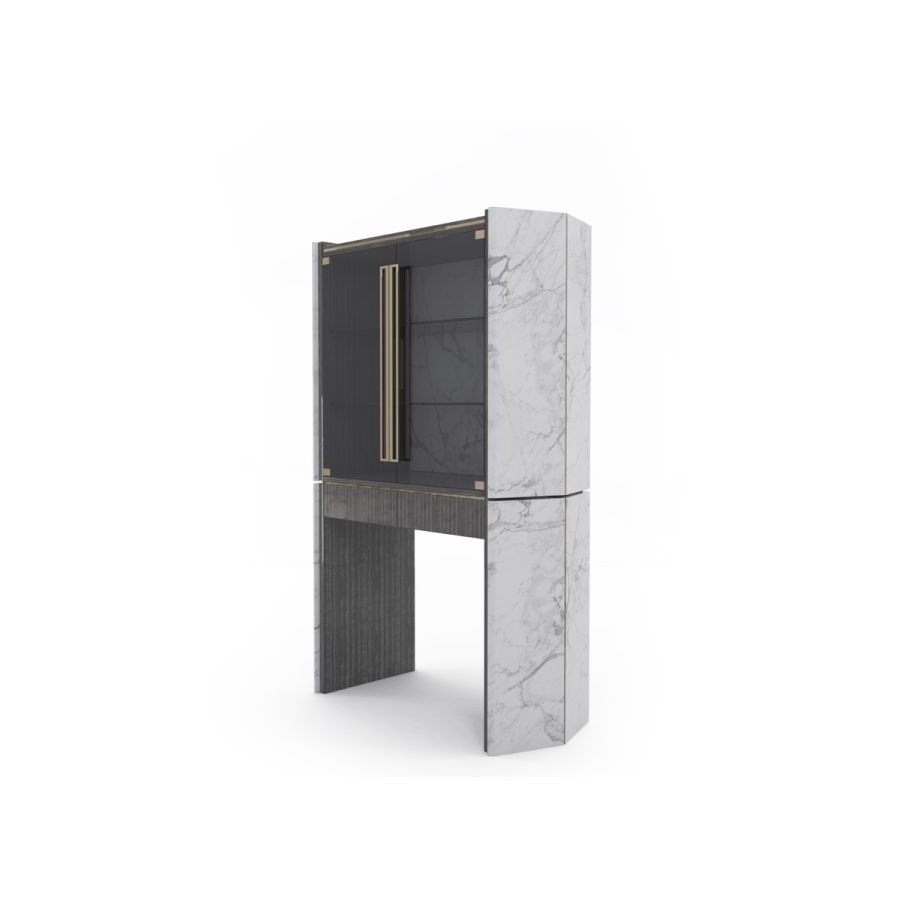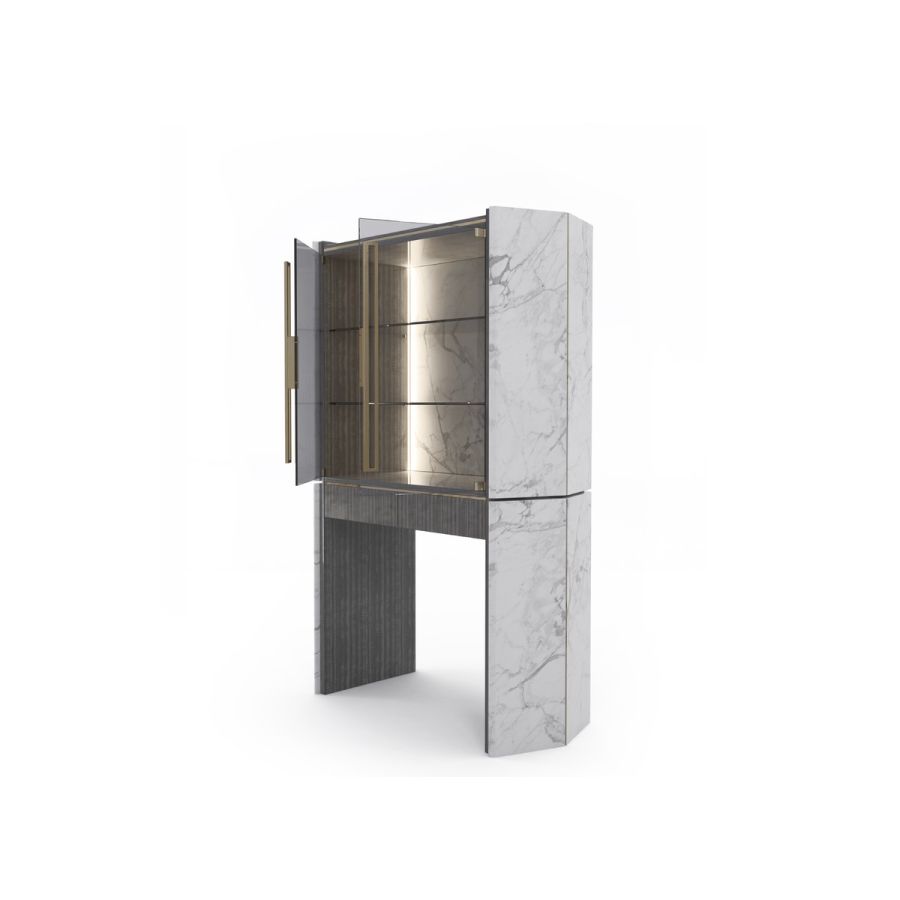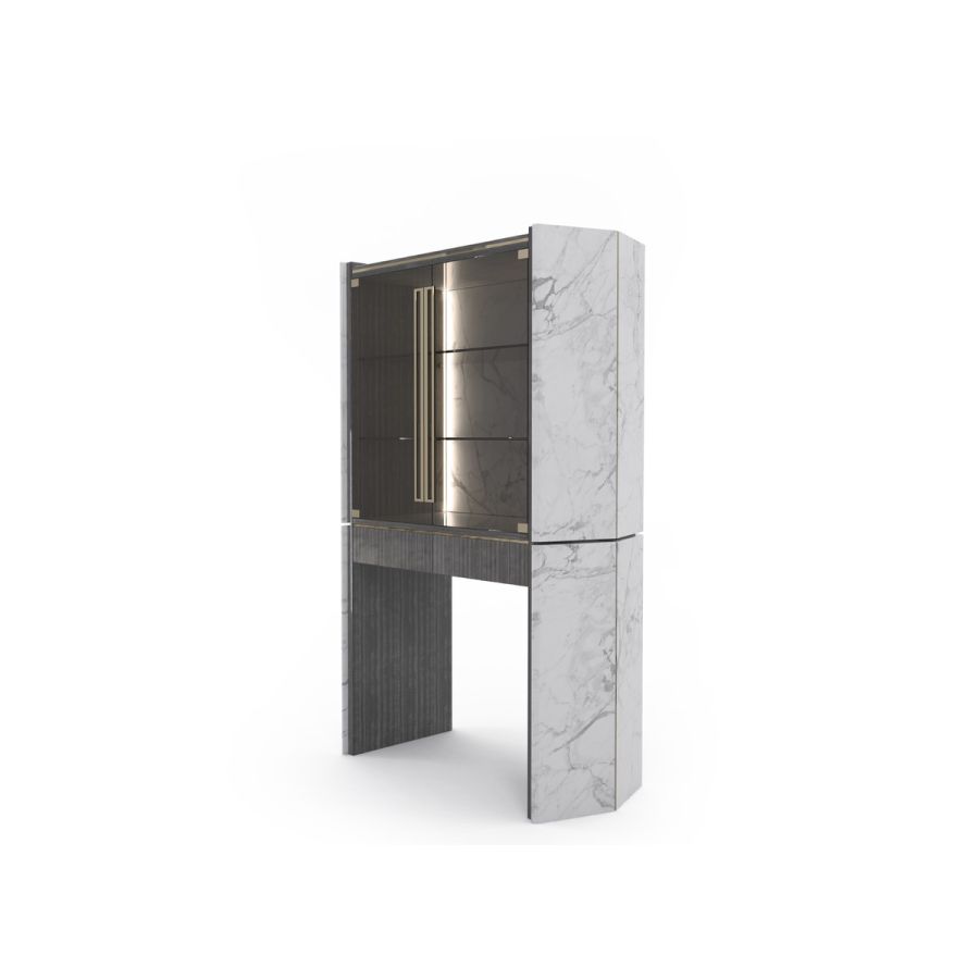 The Algerone Bar Cabinet is a sleek and opulent design solution with architectural features. Its main component is Statuario marble, hence its strong and durable character. Algerone also highlights an interior handcrafted in smoked glass, polished brass, and glossy Eucalyptus Frisé Veneer. Ideal for an open-concept space or a contemporary living room, the Algerone Bar Cabinet is set to create a stunning visual effect.