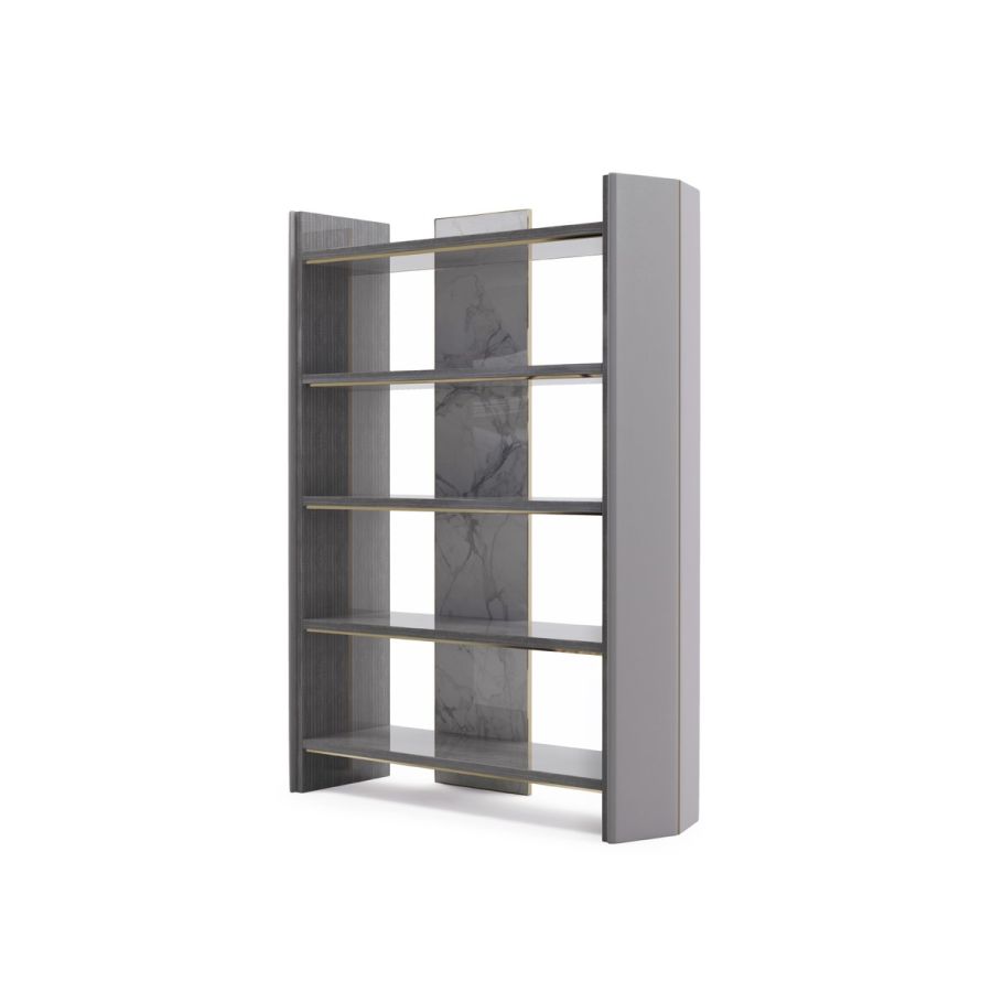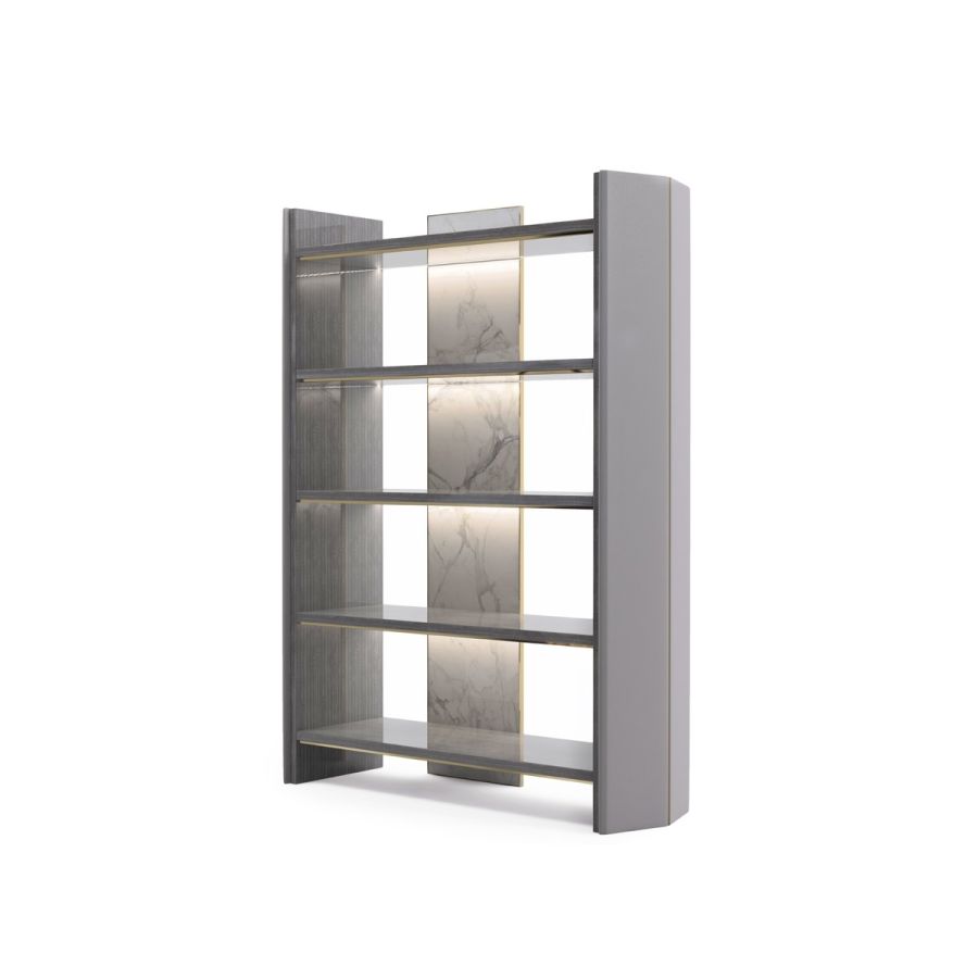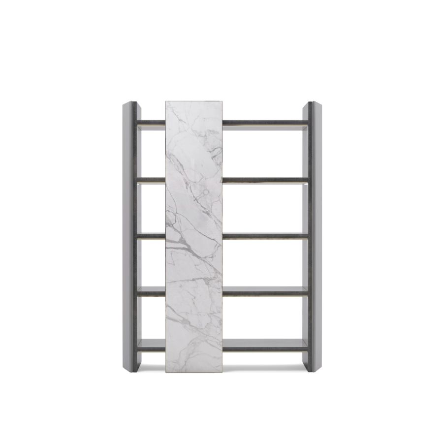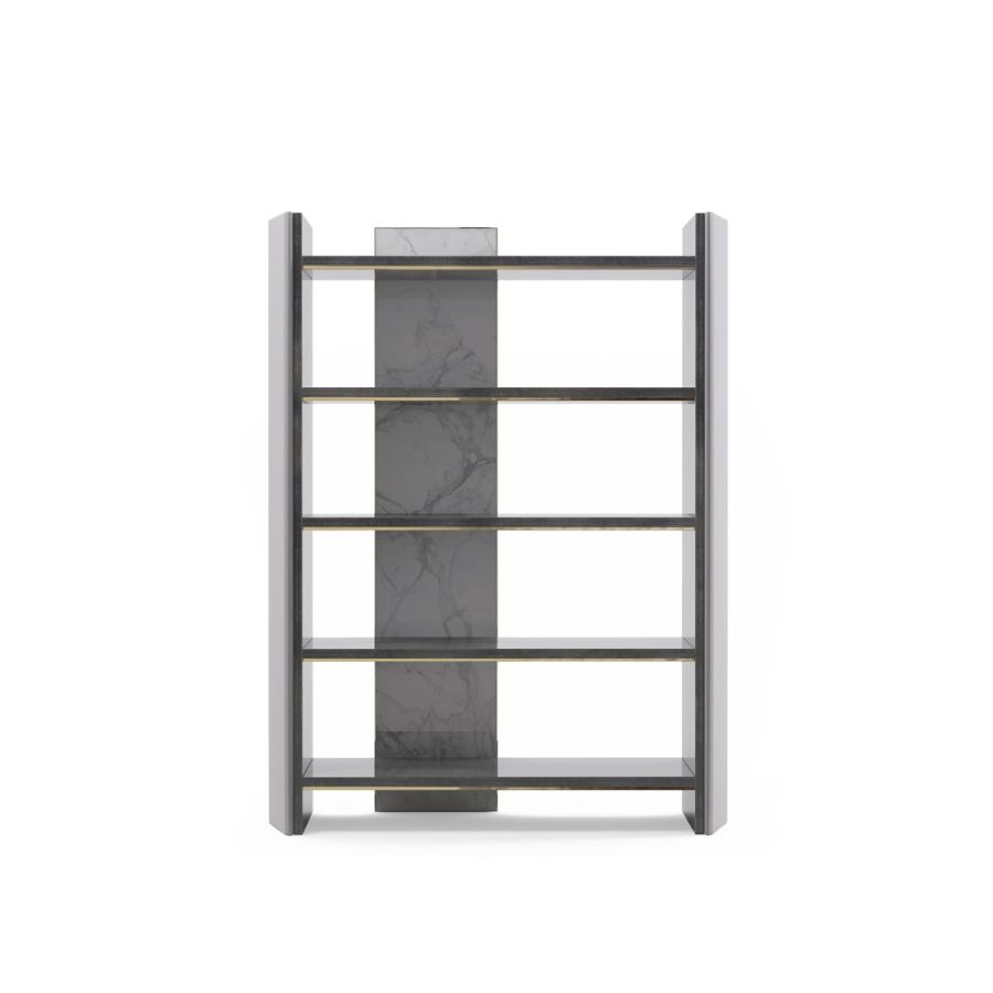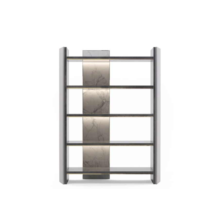 Inspired by architectural elements, the towering Algerone bookcase is bound to add a sense of modern glamour to any home office space. Its sleek structure is enhanced by a series of exquisite finishes, including Statuario marble and glossy Eucalyptus Frisé Veneer which seamlessly match the polished brass detailing found throughout.
