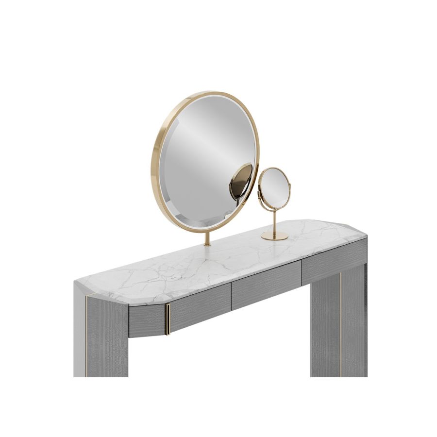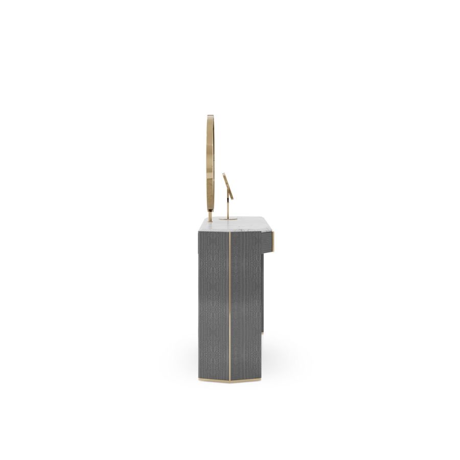 Incorporate a new sense of modernity that only marble can provide into a bedroom, closet, or vanity area with the Algerone Dressing Table. A luxury item made with the most premium materials, such as polished brass, Eucalyptus Frisé Veneer, mirror, and Statuario marble, that has a powerful presence in any ambiance.