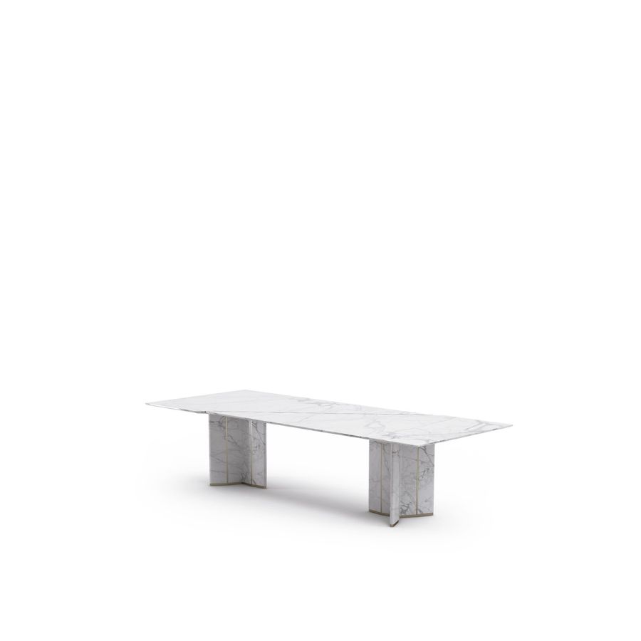 Algerone is an imposing rectangular dining table inspired by sleek architectural elements. This classic piece showcases the strength and classic nature of Statuario marble, which is further enhanced by the presence of meticulously placed brass lines. The intertwinement of these materials makes for quite an alluring decor statement.