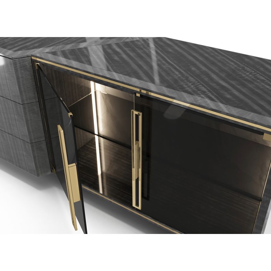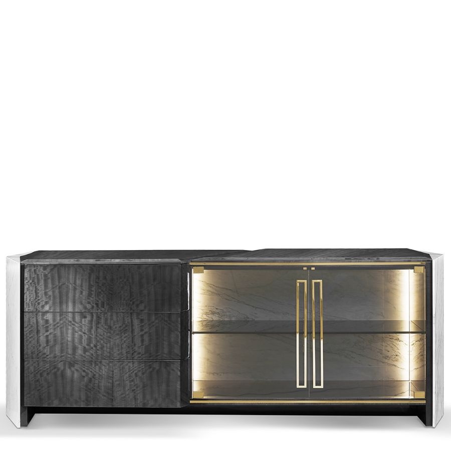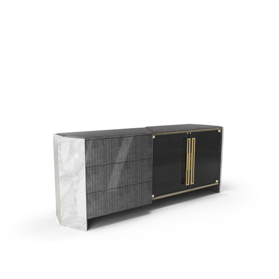 The Algerone Sideboard showcases a medley of luxurious materials while providing practical functionality. The smoked glass doors add a touch of sophistication and offer a glance at the items stored inside. With the powerful presence of Statuario marble and the opulent appeal of polished brass details, this design piece will make a modern statement in any dining room or hallway decor.