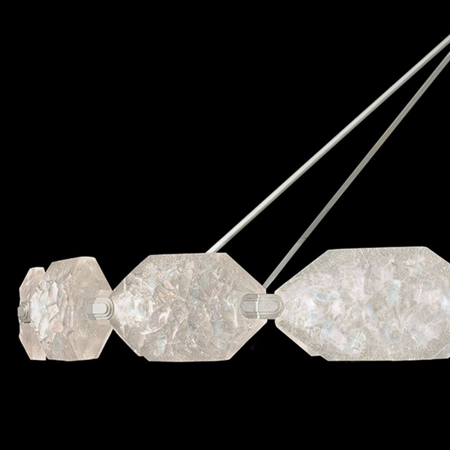 State of the art LED pendant in platinized silver leaf finish, created by acclaimed interior designer Allison Paladino incorporates our exclusive studio process of dichroic rough-cut sculpted glass. Each extra large gem is lit by hidden LED highlighting a subtle dual-colored reflective brilliance. Also available in gold leaf and patinated bronze.