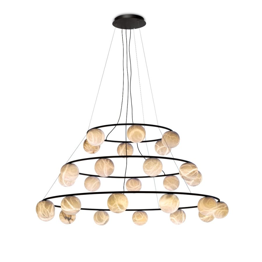 Kollektionen baseras på tre ringar (70, 100 och 130cm i diameter) med 6, 9 eller 12 skärmar vardera. Varje ring kan installeras individuellt, eller bilda en dubbel eller trippel pendel... eller större! Dessa ringar kan vara lika, eller med olika diametrar, och kan installeras med skärmarna vända uppåt eller nedåt enligt inredningens behov. Kablarna som ringarna hänger i kan utgå från själva takkupan, eller så kan de installeras vertikalt ned från taket, vilket lämnar takkupan fri att placeras oberoende. Således är TRIBECA CHANDELIER en kollektion av skräddarsydda armaturer som anpassar sig efter inredarens smak och möjliggör ett stort antal kombinationer utifrån endast 3 strukturer. Det som fascinerar oss mest med TRIBECA CHANDELIER är dess klassiska skönhet och dess mångsidighet. Det är ett säkert kort när det gäller att föra in en iögonfallande stor pendel i ett utrymme. Det tunna böjda röret på ringarna (12mm) erbjuder stor visuell lätthet, alabastern ger genomsläpplighet med varje skärms unika ådring, och den majestätiska designen är en magnet för ögonen. I sina enkla versioner är TRIBECA CHANDELIER utformad för att belysa, till exempel, ett matbord; de många versionerna är idealiska för stora atrier, trappljus eller stora ytor i restauranger eller hotell.