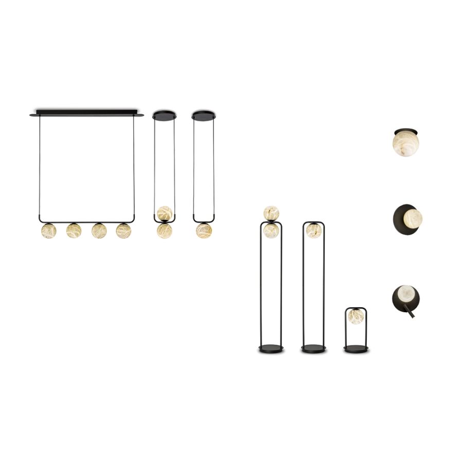 TRIBECA-kollektionen består av en enkel pendel med en skärm och två överlagrade, en annan med fyra lampor med en linjär takkåpa, en bordslampa med en skärm, och två golvlampor med en skärm respektive två överlagrade skärmar. Slutligen har kollektionen en enkel vägglampa, en annan vägglampa med läsarm och en downlight. Konstruktionerna är gjorda av texturerat svart järn och alla skärmarna är 12cm-diameter alabastersfärer, som inkluderar en integrerad 4.5W 270lm 2700K LED.