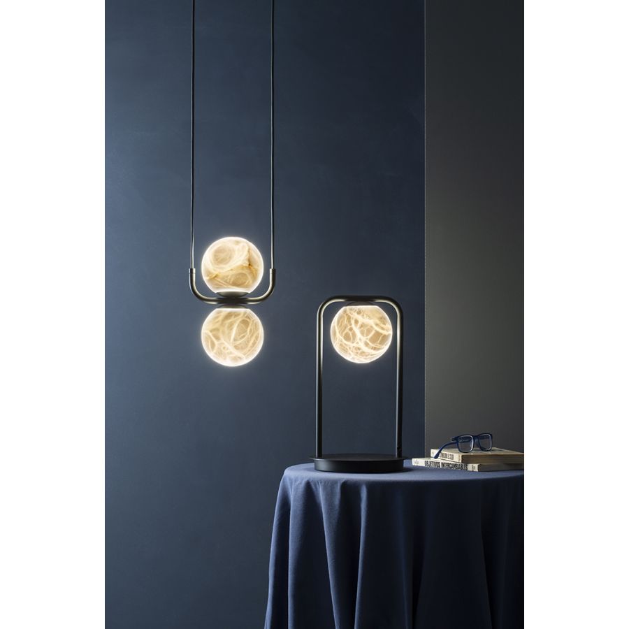 TRIBECA-kollektionen består av en enda pendel med en skärm och två överlagrade, en annan med fyra ljus med en linjär takkåpa, en bordslampa med en skärm, och två golvlampor med en skärm och två överlagrade skärmar. Slutligen har kollektionen en enkel vägglampa, en annan vägglampa med läsarm, och en infälld takarmatur. Stommarna är gjorda av texturerat svart järn och alla skärmar är 12cm-diameter alabastersfärer, som inkluderar en integrerad 4.5W 270lm 2700K LED.