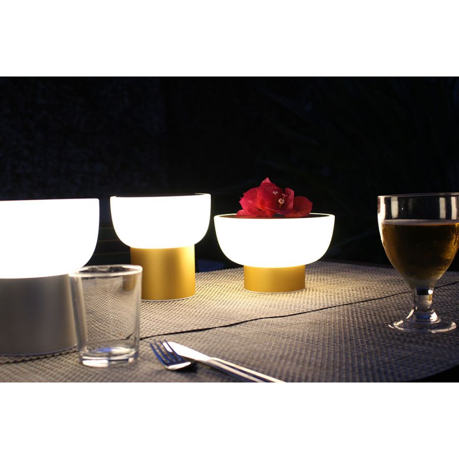 PATIO finns i två versioner: låg (H.13cm & 20cm diam.skärm), och hög (H.16.5cm & 16cm diam.skärm). Den finns i två ytbehandlingar, guld och silver. Skärmen är tillverkad av rotationsgjuten polyeten och har ett anodiserat aluminiumlock som förhindrar bländning. Inkluderar en integrerad Citizen 5V 1.2A max.3W 290lm 3000K CRI>90 LED. Den har ett Li-Ion-batteri med en maximal autonomi på 8-10 timmar och en full laddningstid på 6 timmar, som laddas med en USB-kontakt (laddare medföljer ej). Dessutom har basen silikonstopp för att förhindra att lampan glider på underlaget.
