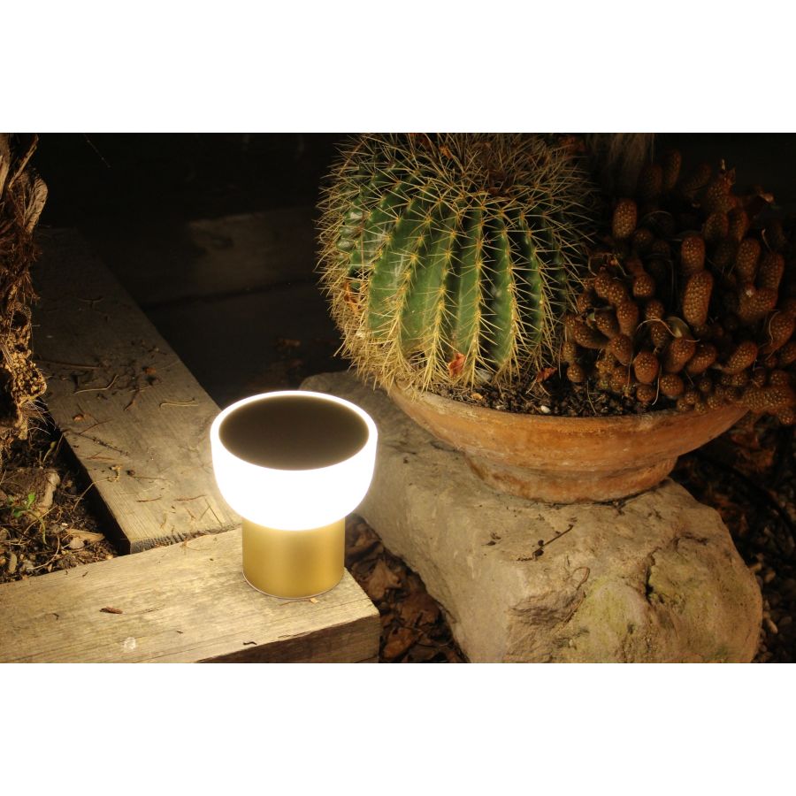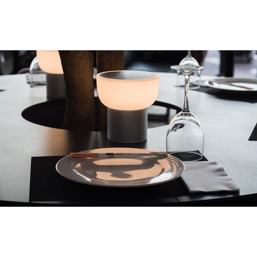 PATIO är en batteridriven bordslampa med en lekfull design, utformad för att belysa ett bord, både inomhus och utomhus, utan behov av ett eluttag eftersom den är en trådlös armatur.
