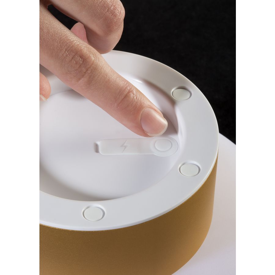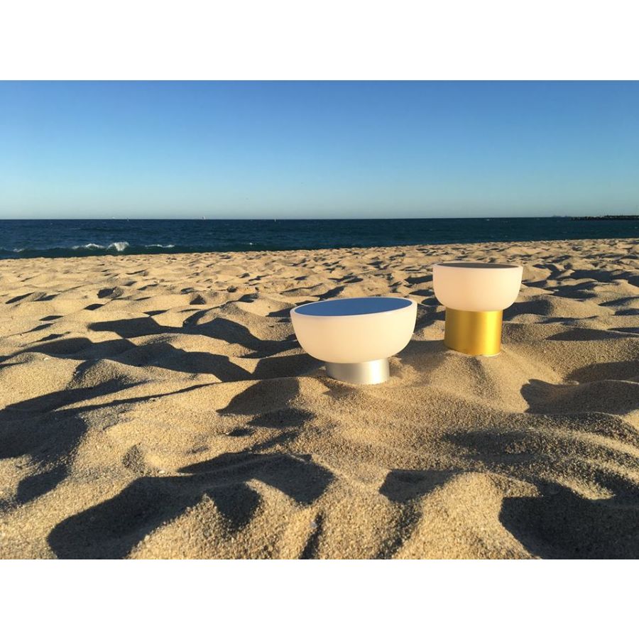 PATIO finns i två versioner: låg (H.13cm & 20cm diam.skärm), och hög (H.16.5cm & 16cm diam.skärm). Den har två ytbehandlingar, guld och silver. Skärmen är gjord av rotationsgjuten polyeten och har ett anodiserat aluminiumlock som förhindrar bländning. Inkluderar en integrerad Citizen 5V 1.2A max.3W 290lm 3000K CRI>90 LED. Den har ett Li-Ion-batteri med en maximal autonomi på 8-10 timmar och en full laddningstid på 6 timmar, vilket laddas med hjälp av en USB-kontakt (laddare medföljer ej). Dessutom har basen silikonstopp för att förhindra att lampan glider på underlaget.